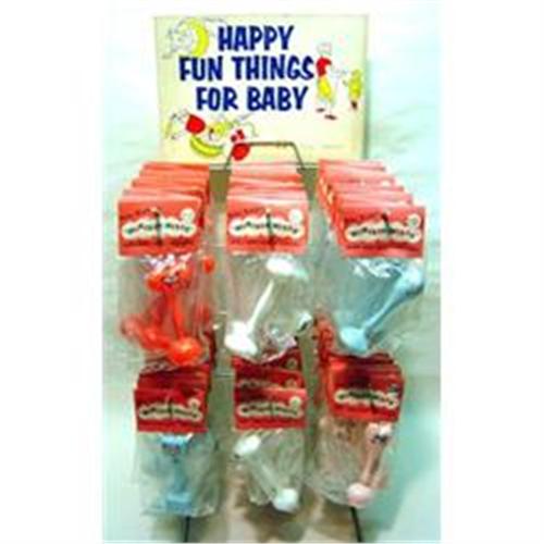 1950's Huge Dime Store Baby Rattle Display, the display has 60+ assorted hard plastic baby rattles, each in it own package, the display is 24" tall, and 12 " wide, with 6 hooks, great old counter display from the old Dime Store days.. <BR>