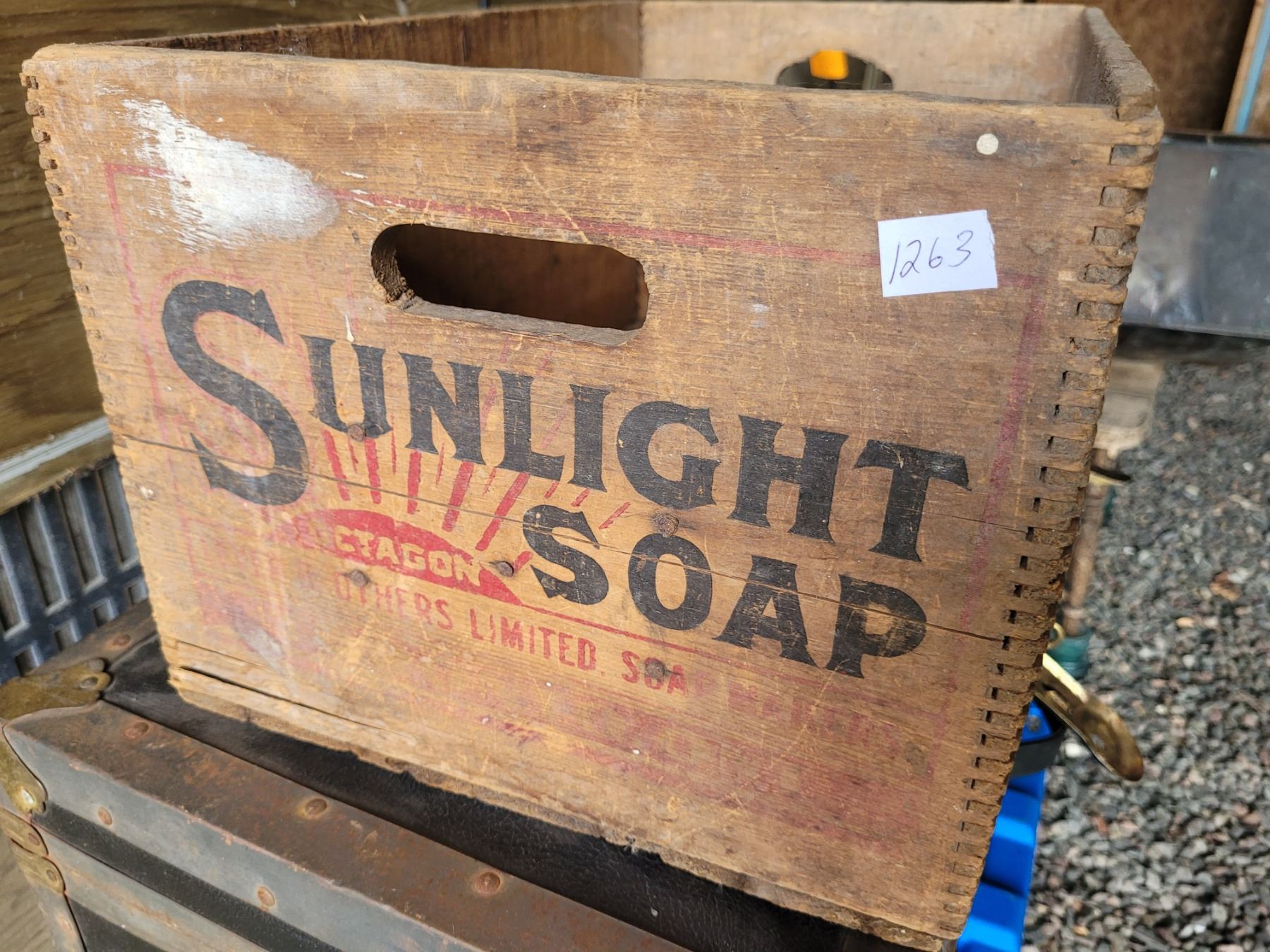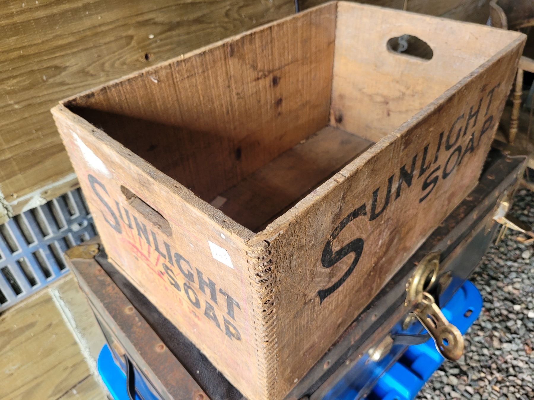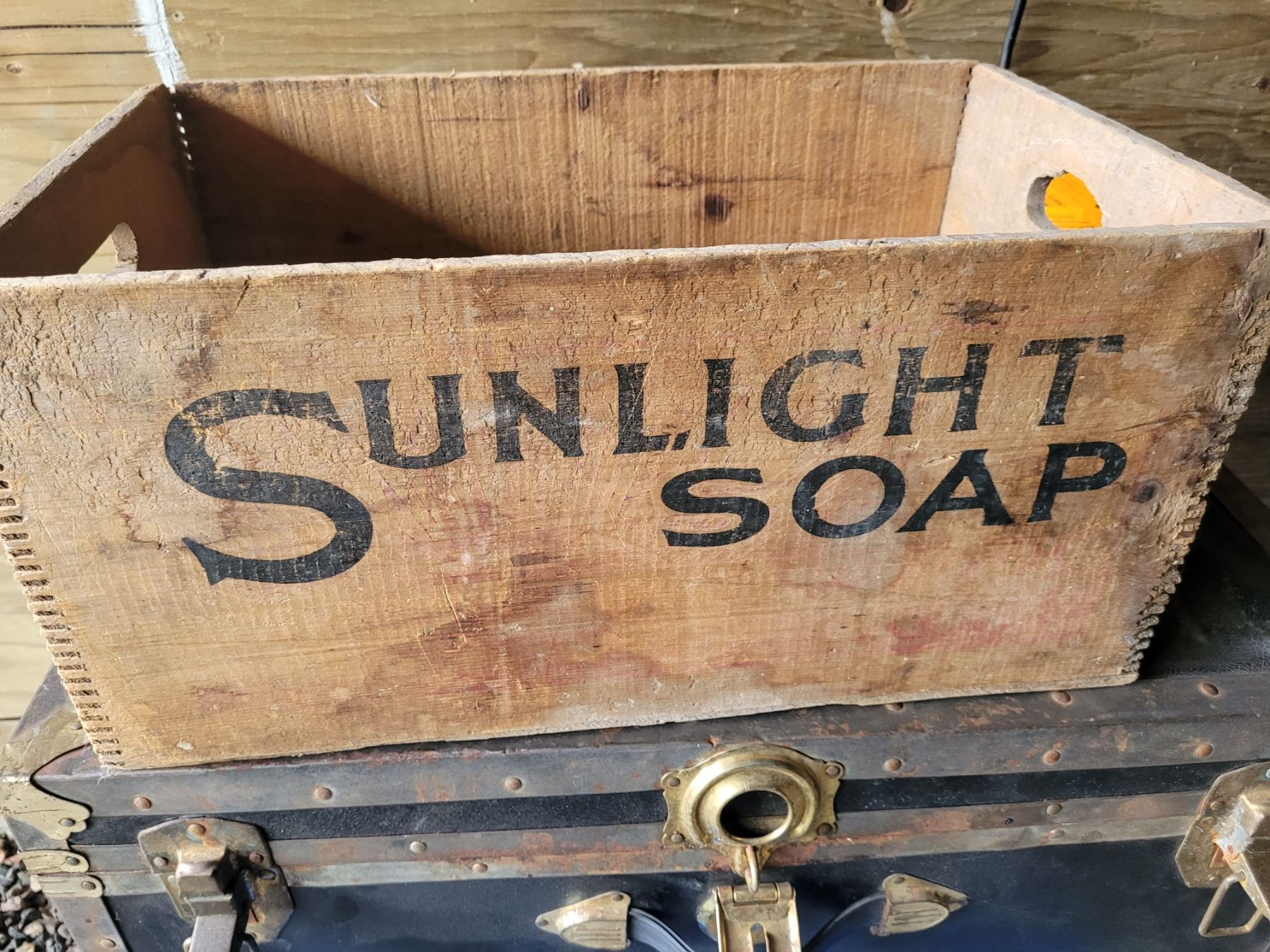 Old wooden box Sunlight soap with bisquit joint corners