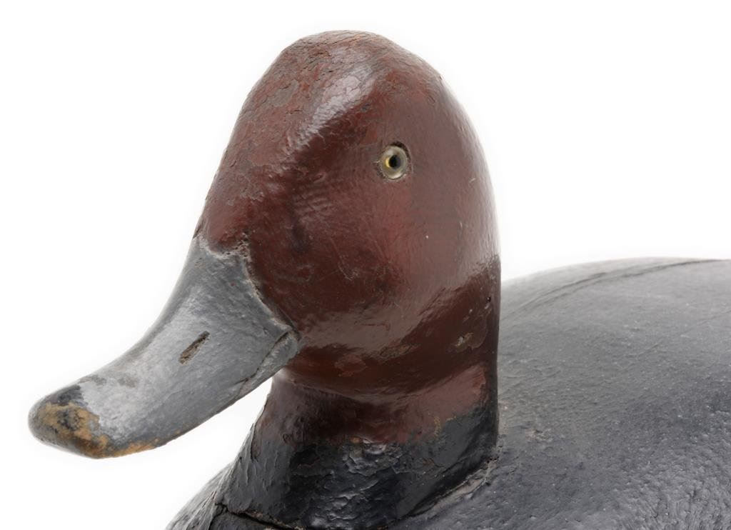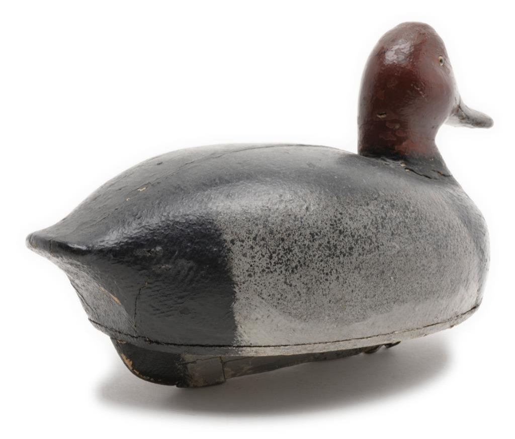 Old wooden duck decoy displaying the majority of what appears to be its original paint, glass eyes, approx. 15” long, 8” wide and 9” in height. Old label on bottom of decoy reads “REDHEAD DRAKE – Harsen’s Island, Mich. Maker: Unknown. Probably copied after giant hollow decoys carved by Yock Meldrum of fair Haven”. Overall good condition. Est.: $150-$250.