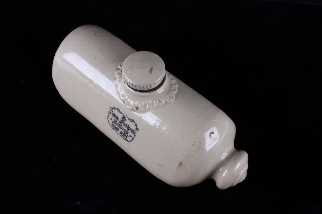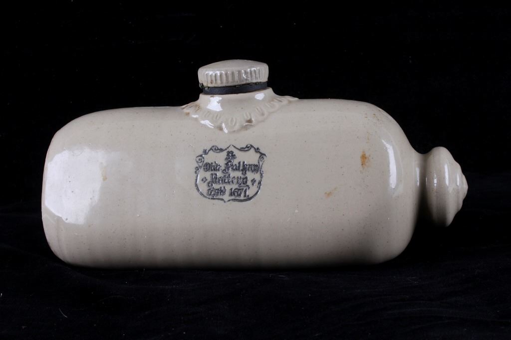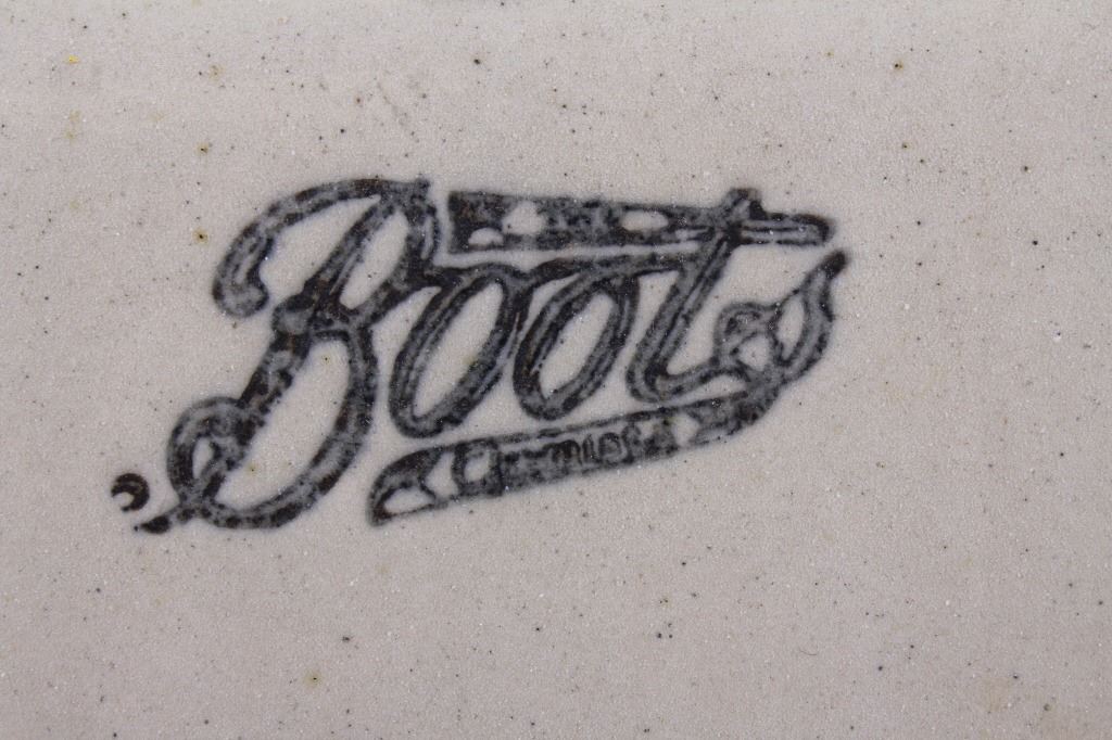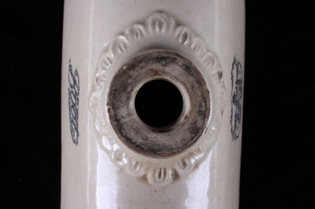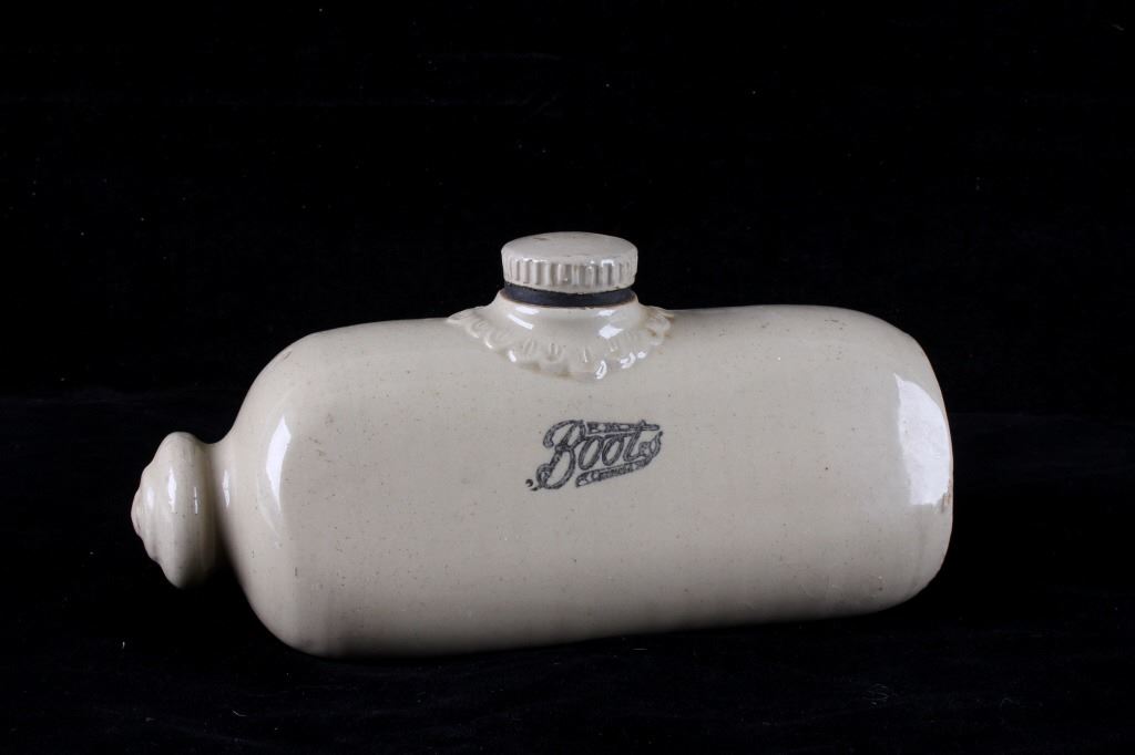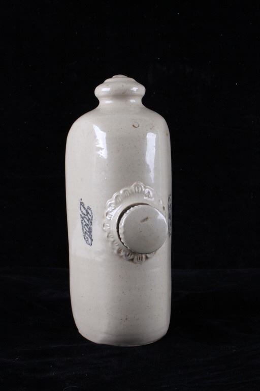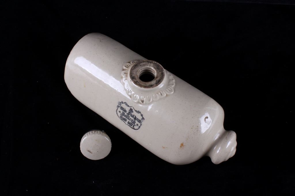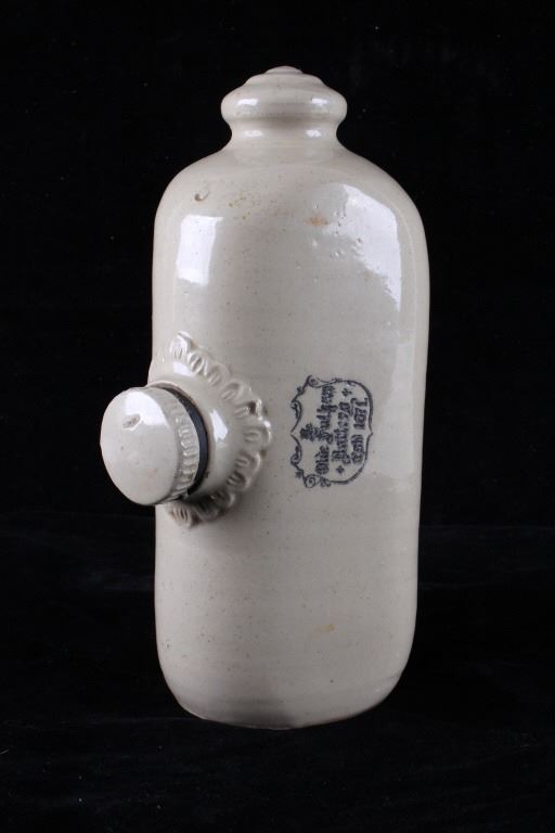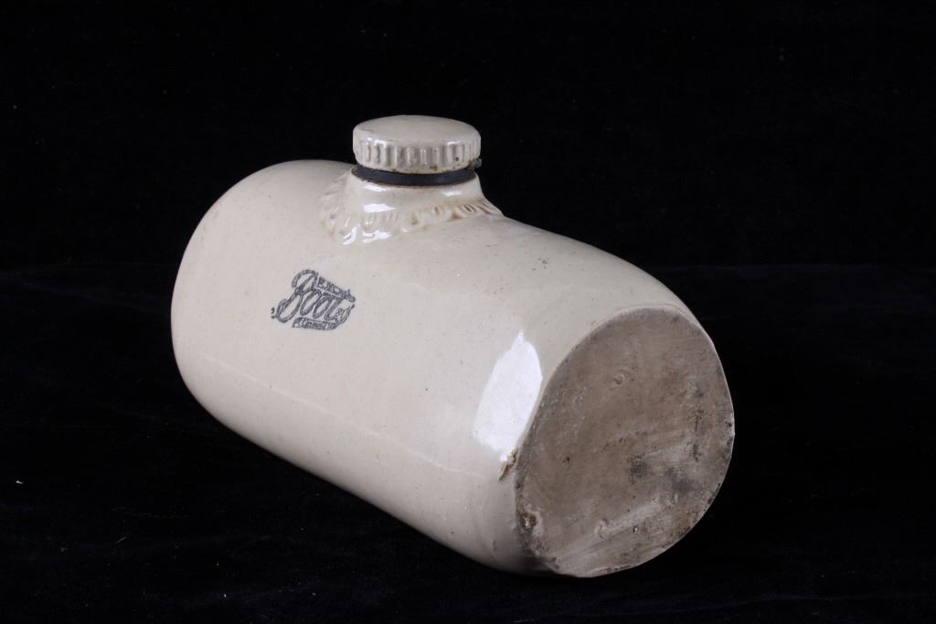 For your consideration is this Olde Fullgam Battery stoneware crock drinking vessel with advertisement for Boots. This crock drinking vessel shows unique design and decoration to the outside of the vessel and a screw off top with beige stoneware construction and a handle shown on the side of the vessel. The condition of this of this drinking vessel is good with some wear marks from age and some wear to the advertisement markings to the outside walls of the vessel. The measurements of this vessel are 5 1/2" x 4 1/2" x 11 1/2".