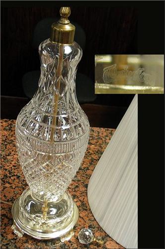 Older 36" tall signed Waterford table lamp with silk pleated shade measuring 18"across the bottom. This lamp is no longer offered by Waterford. It comes with its cut crystal finial