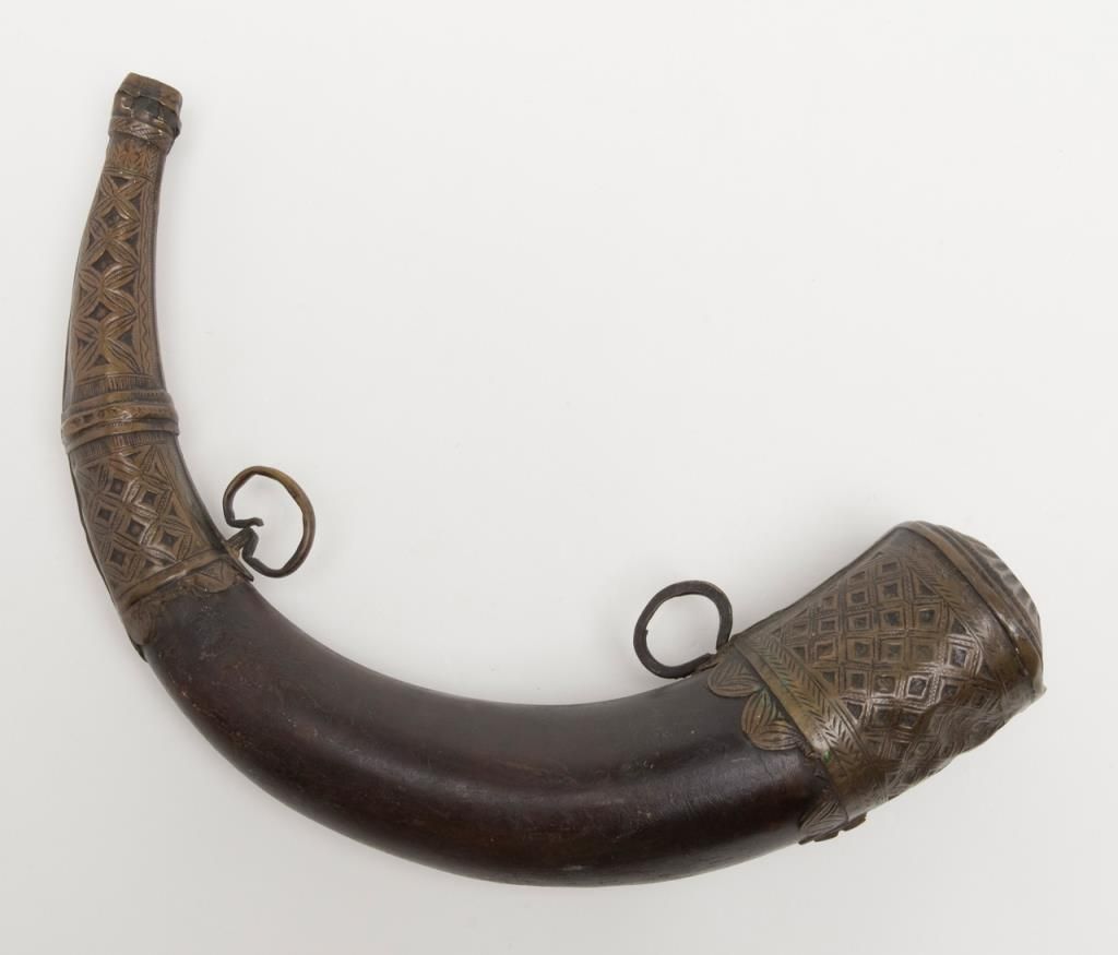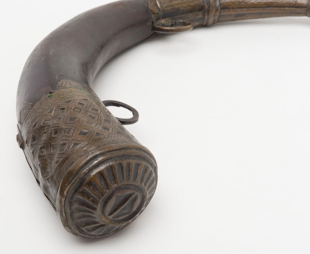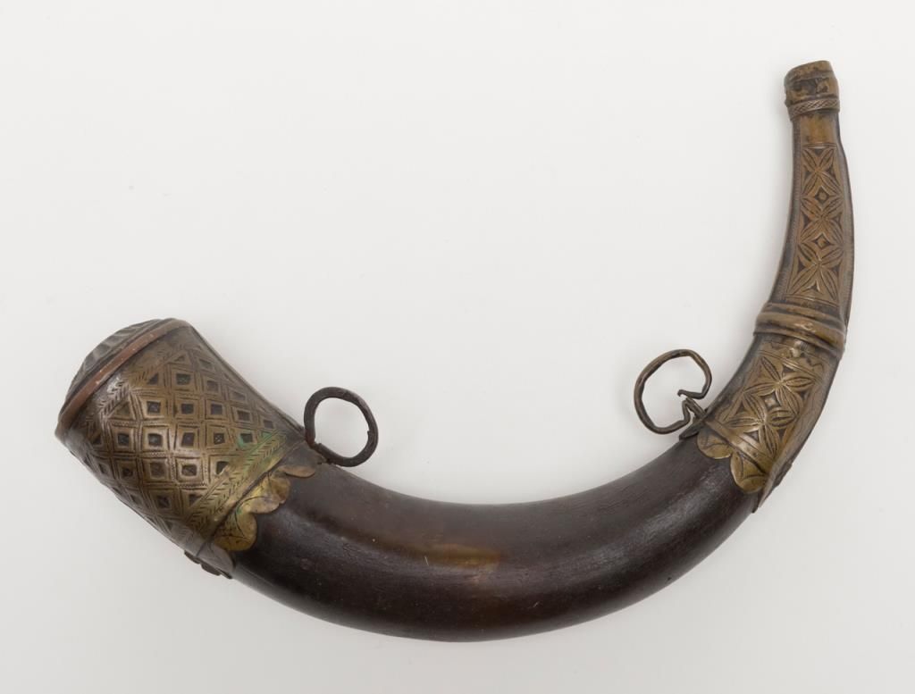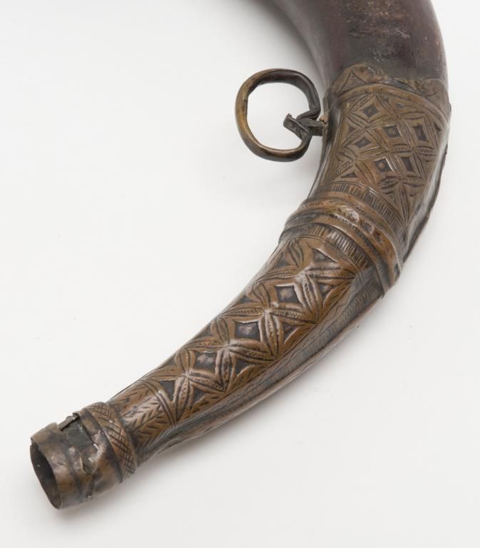 Older Arabic horn powder flask with decorated brass end pieces, approx. 14” overall; great patina! Est.: $50-$100.
