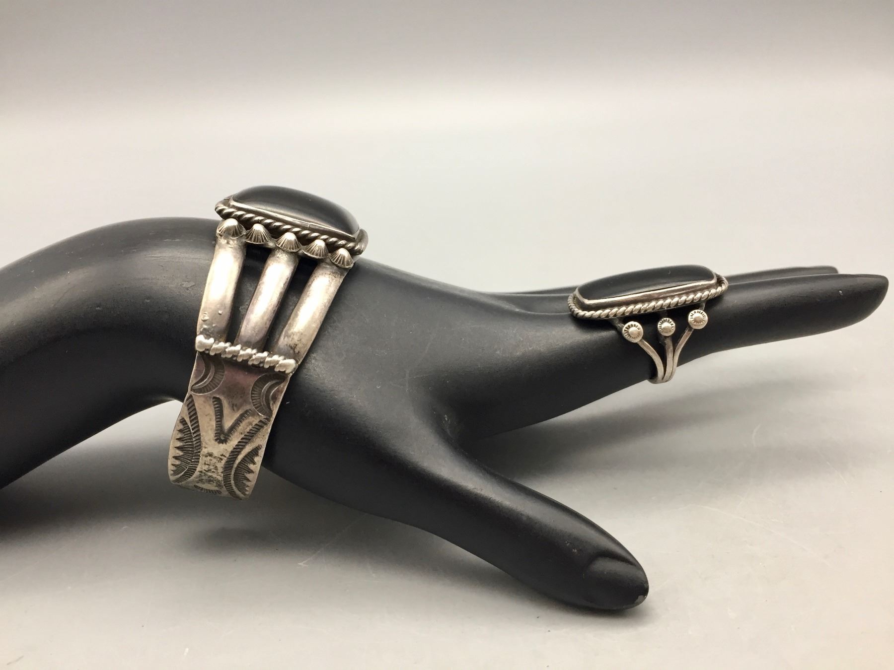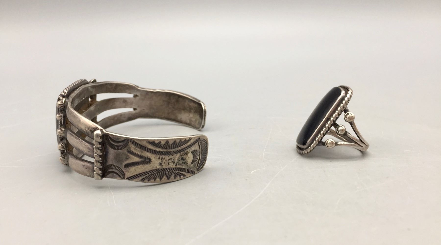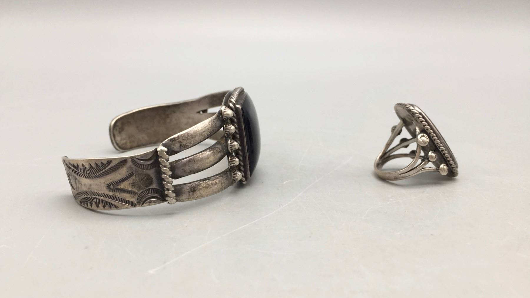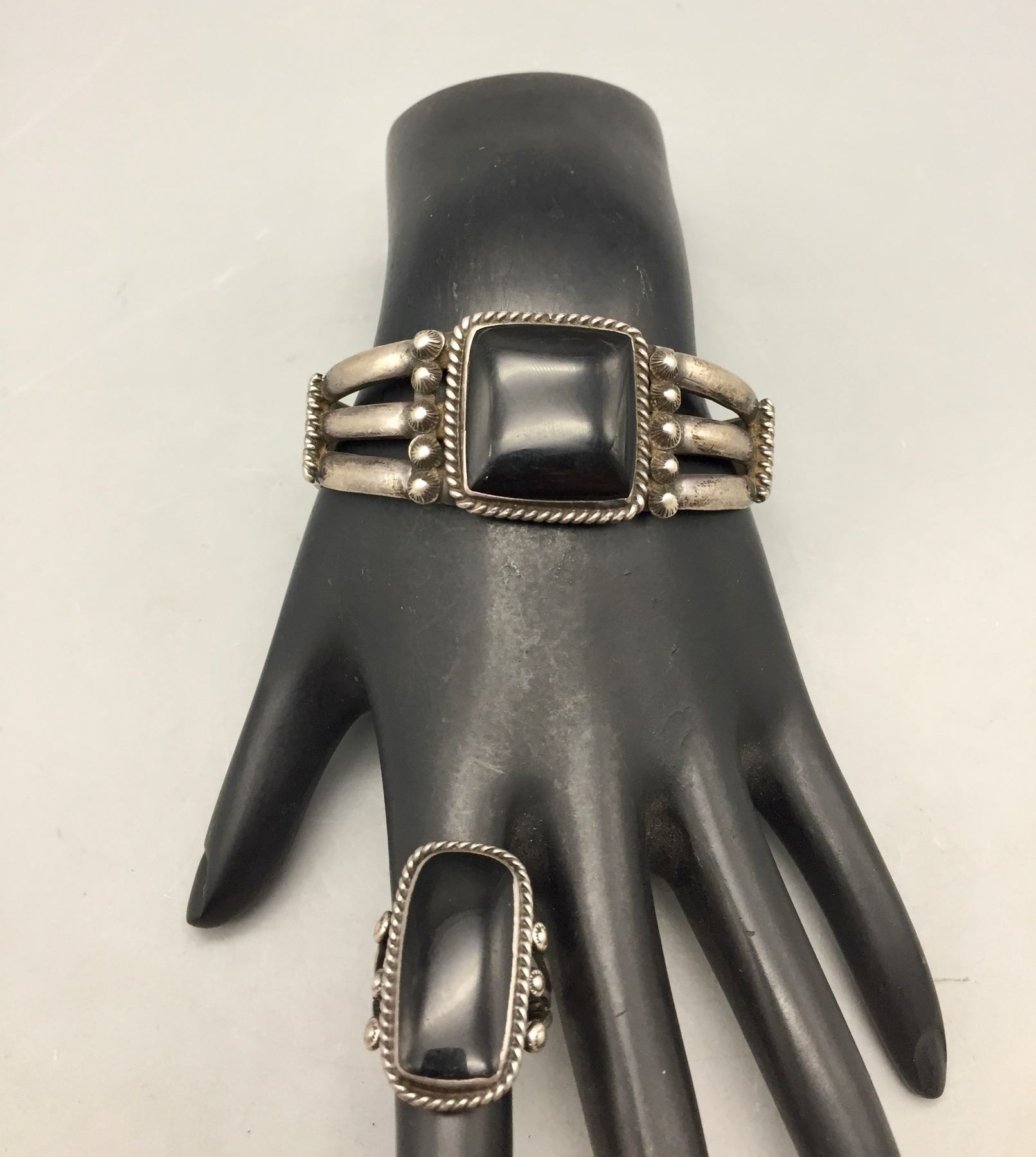 Description: Offered for sale in this lot is a sterling silver ring and bracelet set featuring black onyx cabochons surrounded by hand stamped sterling silver. Good looking older set! Maker: Unknown. Approx. Age: Circa 1940s. Size: Ring: size 4-1/4. Measures 5/8”w x 1-1/8” long. Bracelet: Measures 5-3/8” long opening 1-3/8“ (fits a 6-3/4” wrist) 1-1/8”w. Combined weight 52.2 grams. Condition: Good for its age, normal wear expected. Please look closely at the pictures - they are an important part of our description. Shipping: There will be a $5 handling / packaging fee for shipping this lot. The actual cost of postage will be added on top of that.