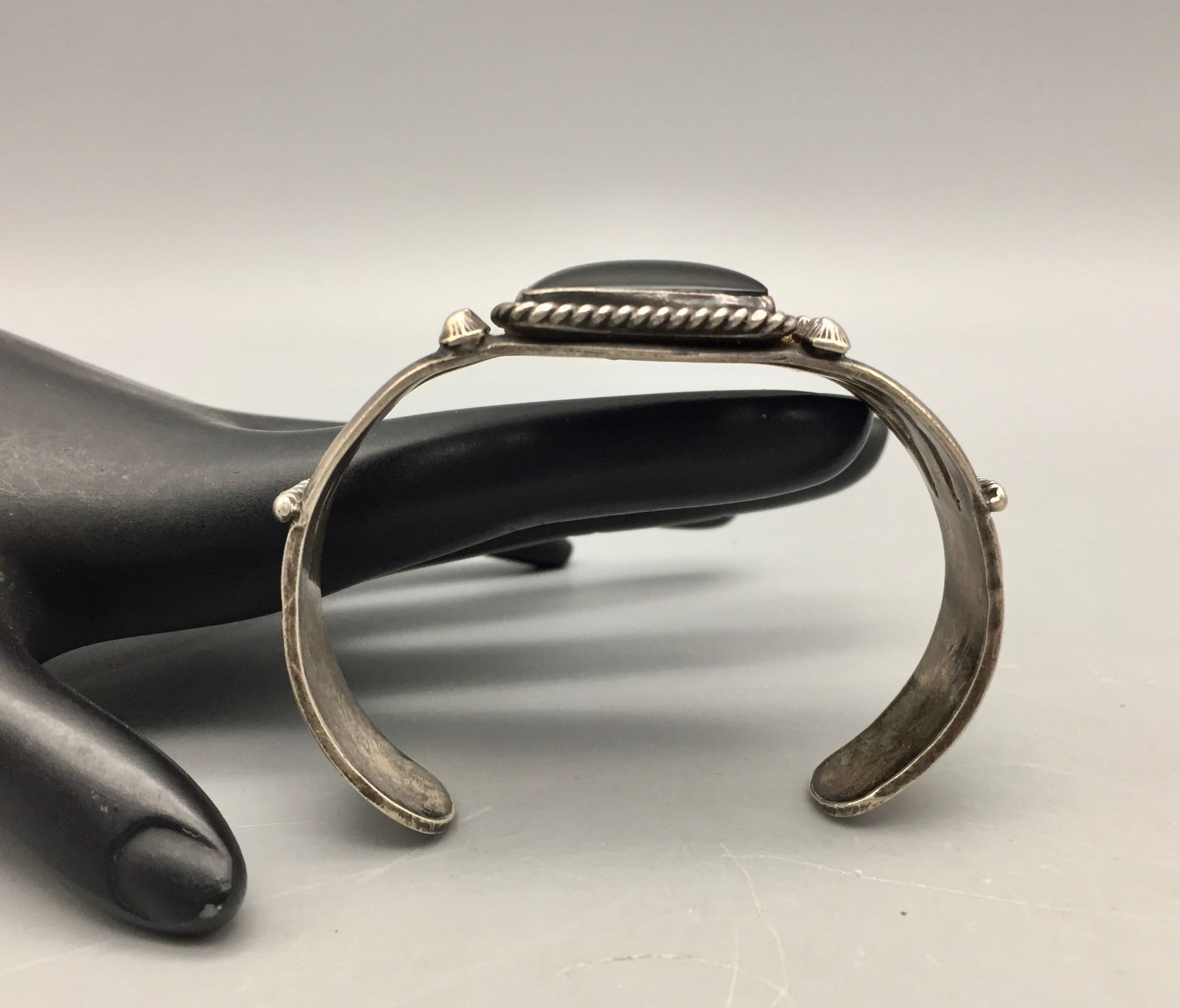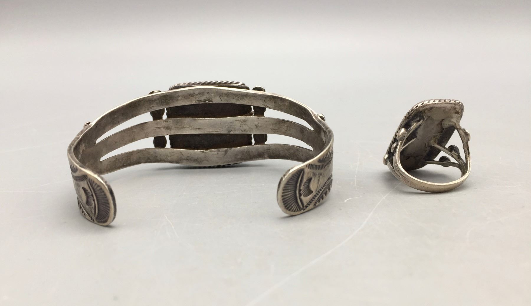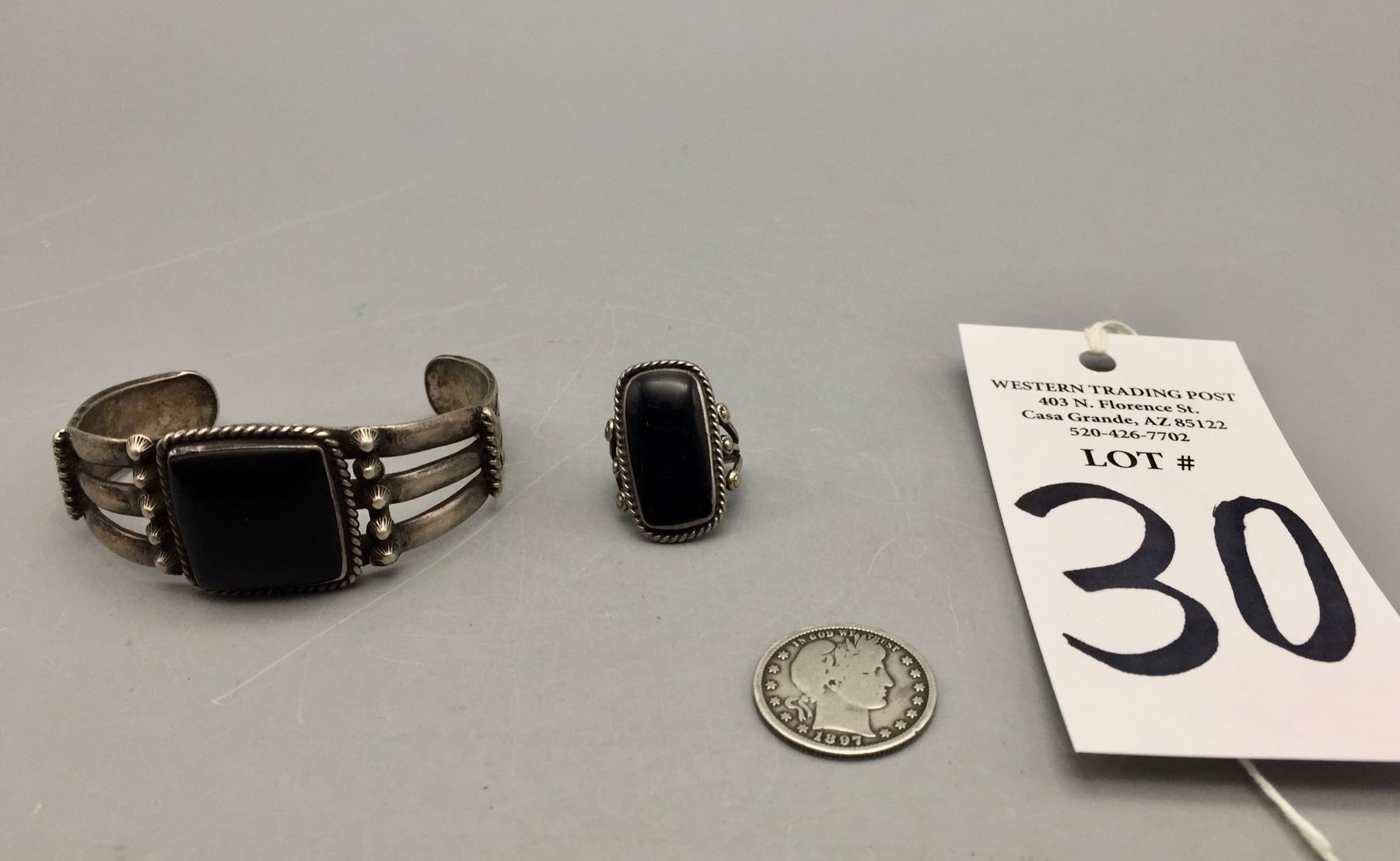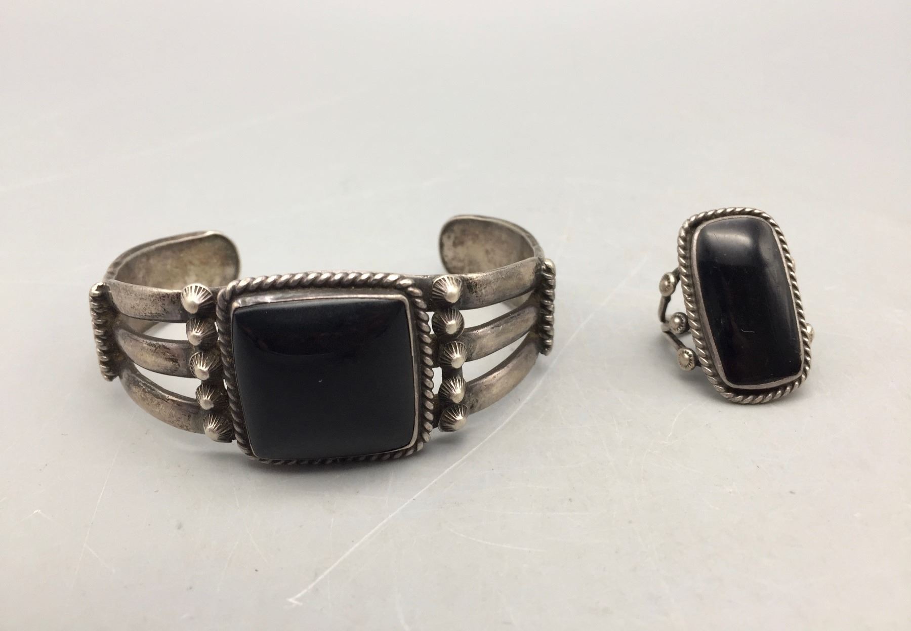 Description: Offered for sale in this lot is a sterling silver ring and bracelet set featuring black onyx cabochons surrounded by hand stamped sterling silver. Good looking older set! Maker: Unknown. Approx. Age: Circa 1940s. Size: Ring: size 4-1/4. Measures 5/8”w x 1-1/8” long. Bracelet: Measures 5-3/8” long opening 1-3/8“ (fits a 6-3/4” wrist) 1-1/8”w. Combined weight 52.2 grams. Condition: Good for its age, normal wear expected. Please look closely at the pictures - they are an important part of our description. Shipping: There will be a $5 handling / packaging fee for shipping this lot. The actual cost of postage will be added on top of that.