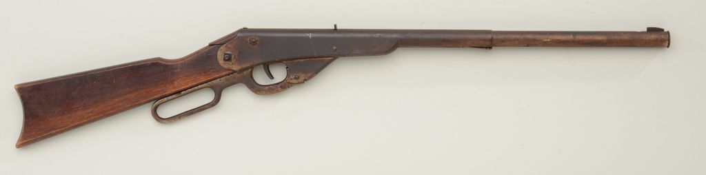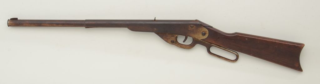 Older Daisy BB gun in form of a lever action rifle in overall fair well-worn condition with wood butt stock; uncleaned with replaced rear frame bolt. Est.: $20-$40.