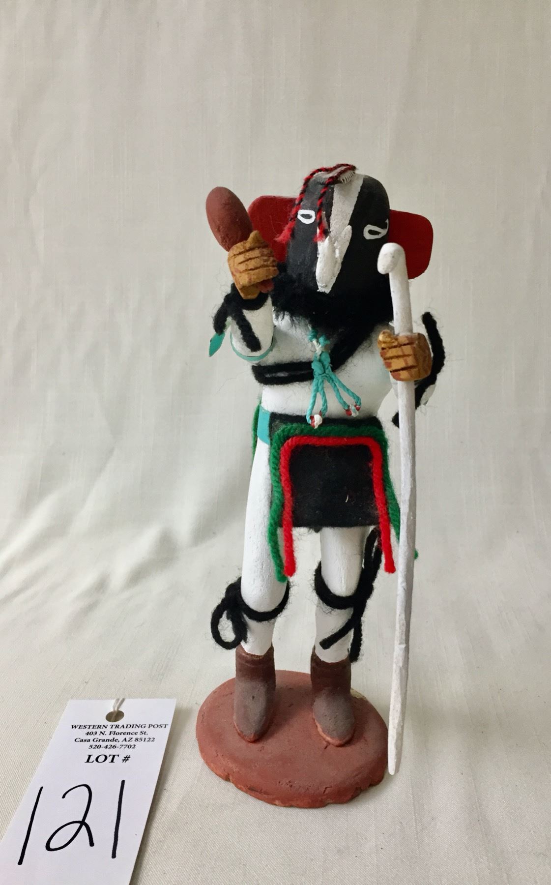 Description: For sale in this lot is a graphic Kachina (when you look under his kilt). It has brightly colored, hand painted and hand crafted details. Maker: Ted Namingha, Hopi. Approx. Age: Vintage. Circa 1970s. Size:9-1/8 inches tall x 3-1/4 inches wide. Condition: Good for its age, normal wear expected. Please look closely at the pictures - they are an important part of our description. Shipping: There will be a $8 handling, packaging fee for shipping this lot. The actual cost of postage will be added on top of that.