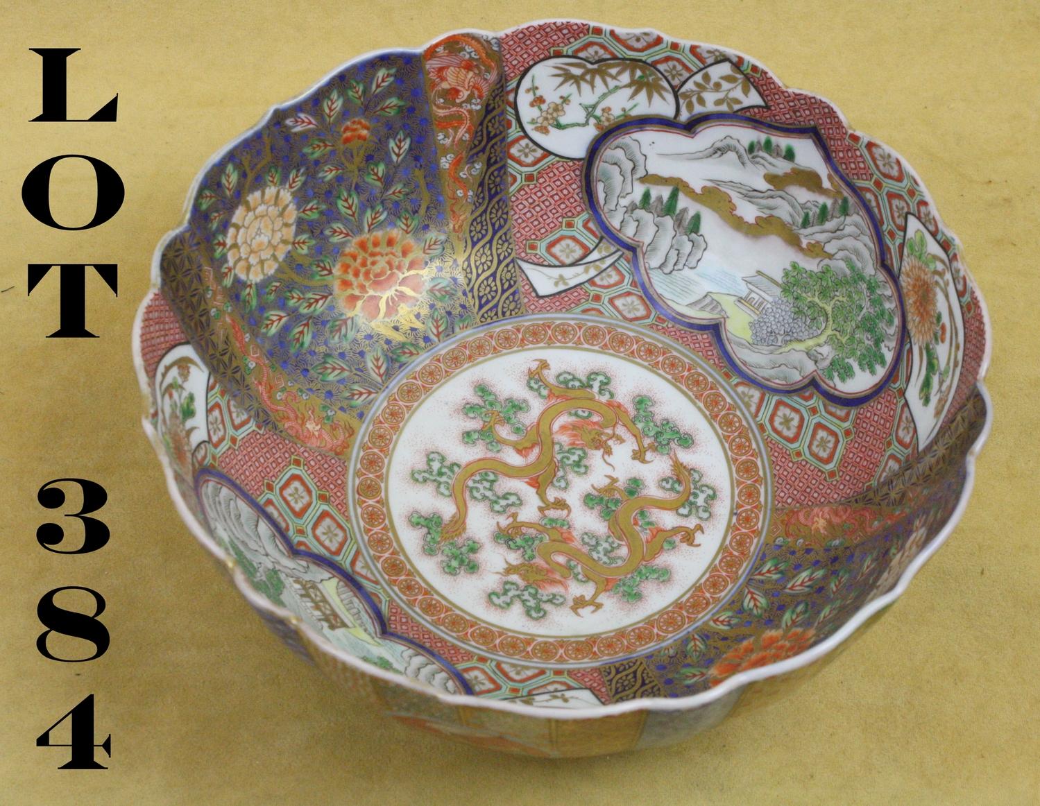 Older Japanese Imari war bowl, approx. 10” in diameter and approx. 4” in height in overall good condition at the time of description; shows designs of flowers, dragons, landscapes and pagoda with mon (signature) at bottom of bowl in shape of a Chrysanthemum flower. May be a real sleeper as consignor has included copy of a note dated 1981 from Bernard Hurtig’s Oriental Treasures and Points West, indicating this piece to becirca 1860 with a noted selling price at the time of $4,700 indicating the mon was of the royal household. Est.: $250--$500.