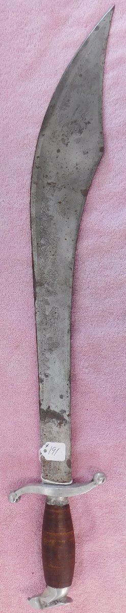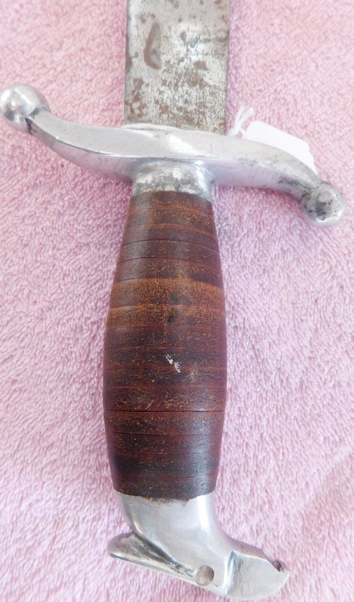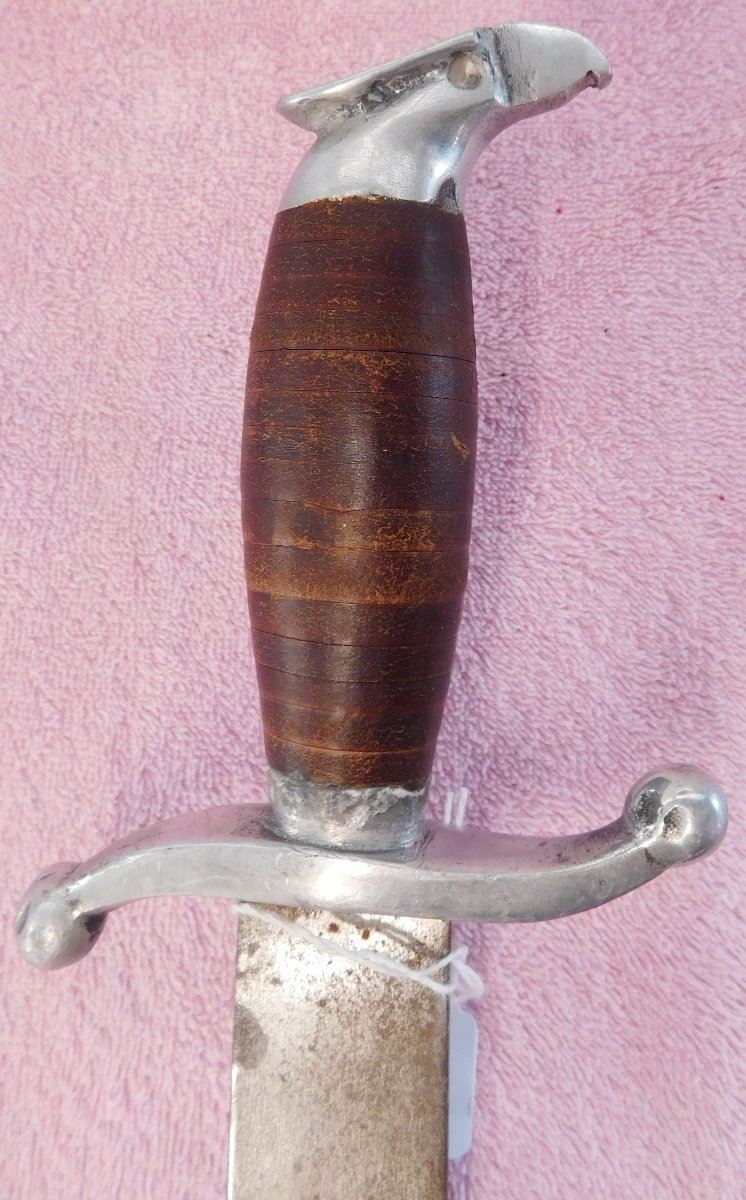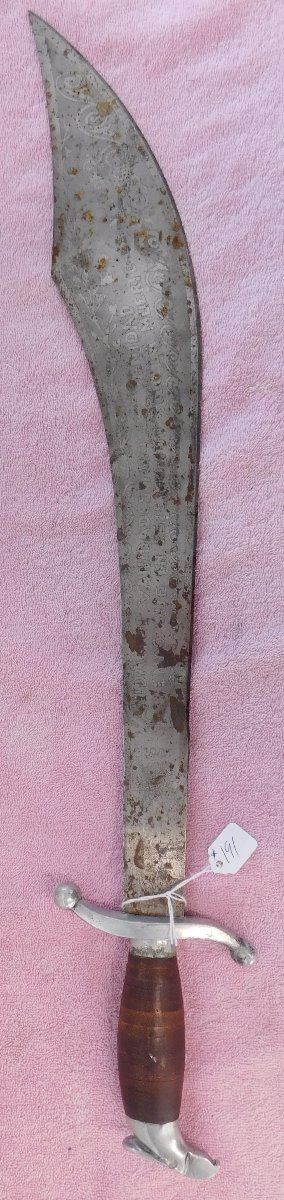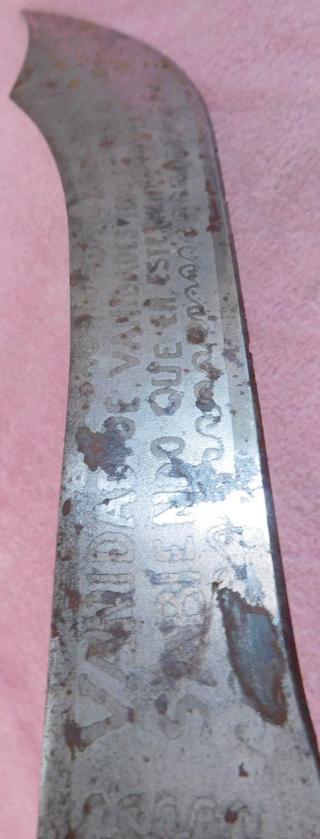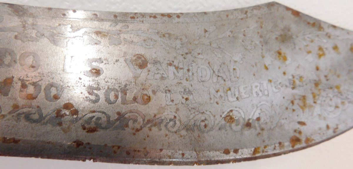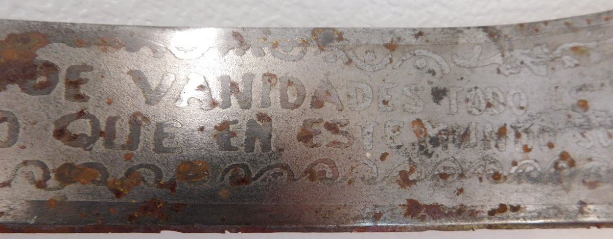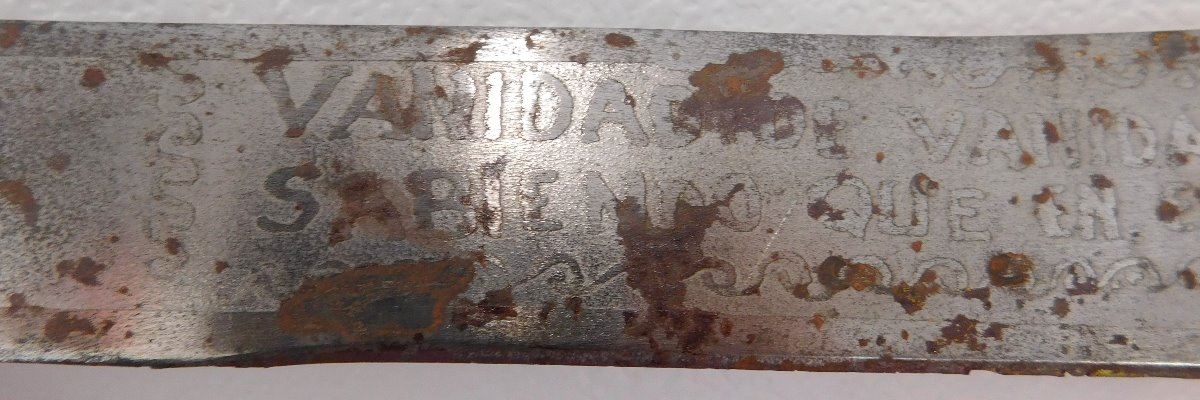 Older Mexican Sword w/Lettering, circa 1950s. Made of leather ring handle and steel, the item is 27" x 6". Mexico. Biblical message on blade in Spanish, "vanity of vanities, all is vanity, knowing in this world only death is truth." Condition: Good, minor rust, see images. Shipping: $25.50 w/insurance and signature, due to length.