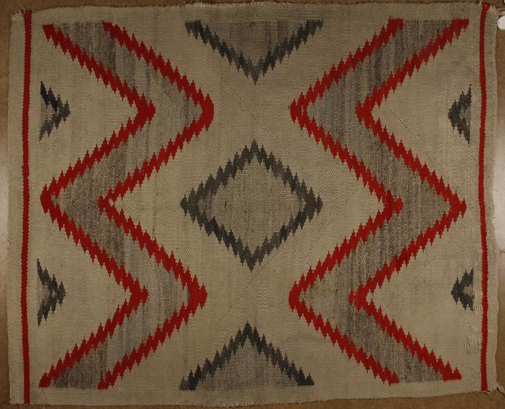 With eye dazzler pattern with orange and grey colors. Measures 55" x 44". In fair condition with losses and edge fraying.