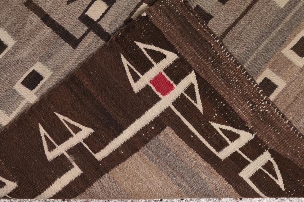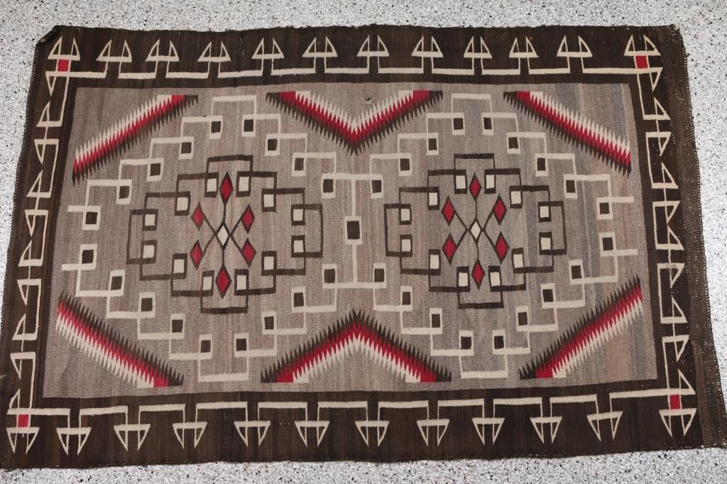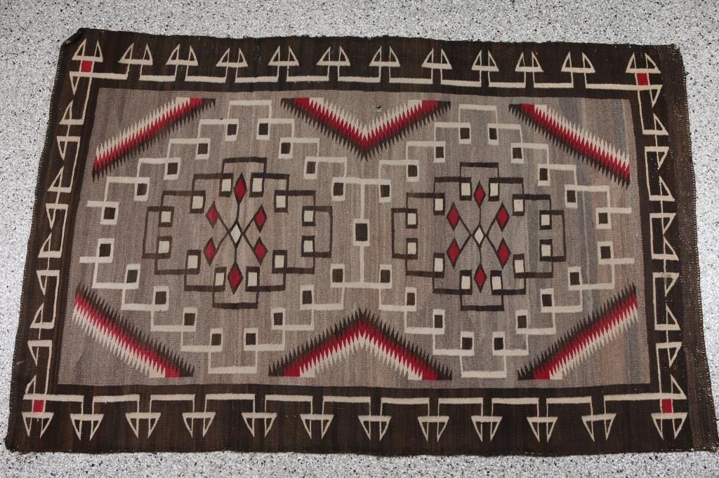Traditional brown, white, and gray. In fair condition, edges show wear. Measures 43"x36".