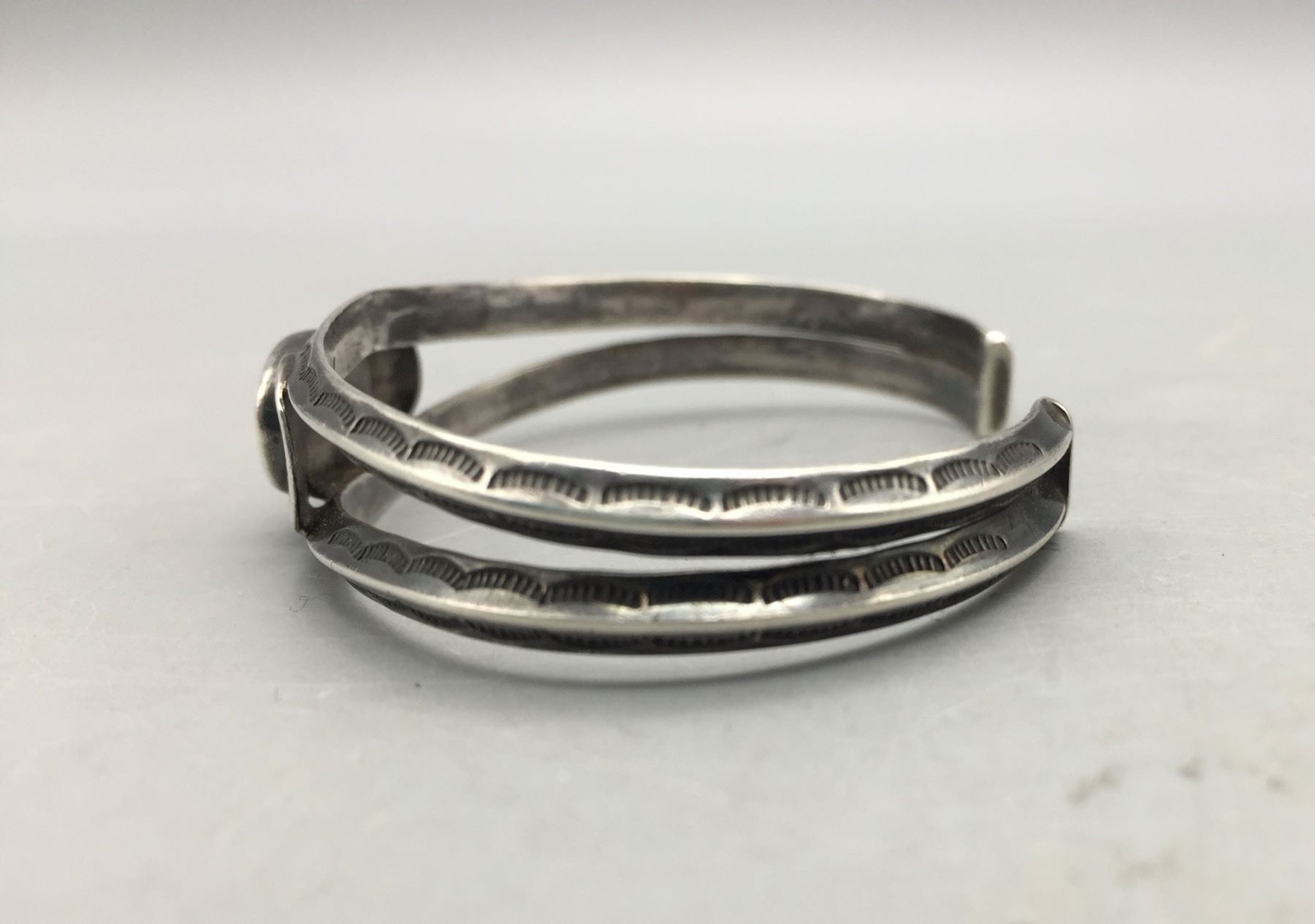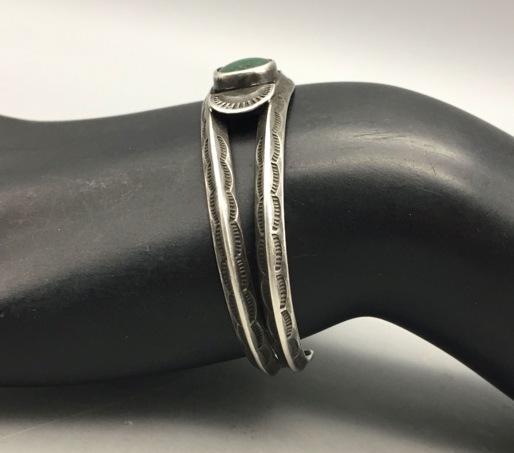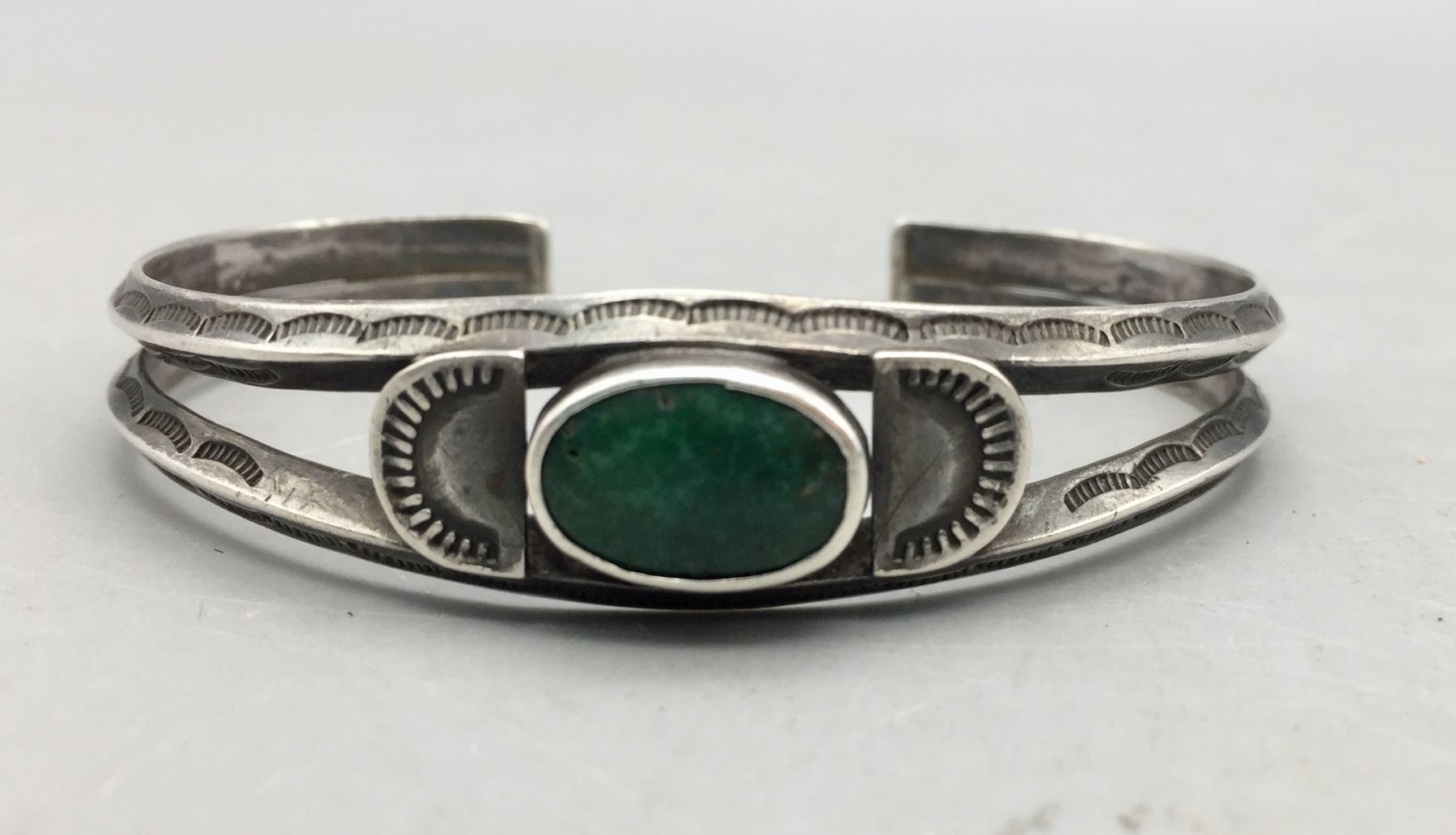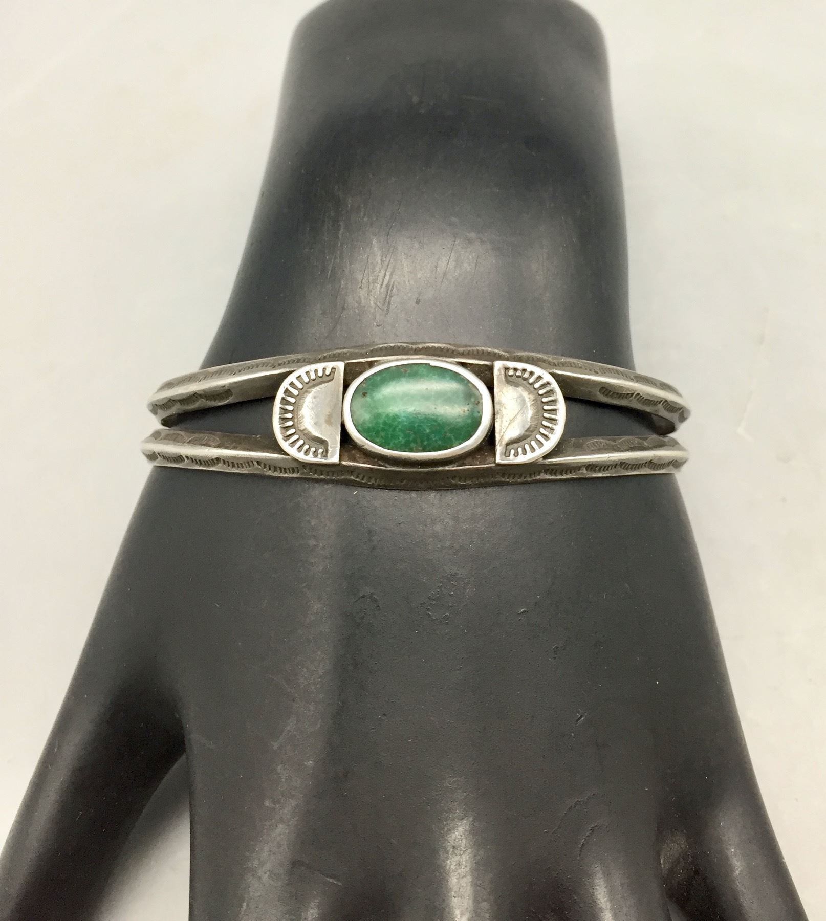 Description: Presented for sale in this lot is a nice, older turquoise and sterling silver bracelet. It has simple stamp work with a dark green turquoise stone set in sterling silver. Maker: Unknown. Approx. Age: Vintage. Size: Inside circumference measures 5-1/2â€. Opening is an additional 7/8â€, fitting a 6-3/8†wrist. Width is 5/8â€. Weighs 17.8 grams. Condition: Good for its age, normal wear expected. Please look closely at the pictures - they are an important part of our description. Shipping: There will be a $5 handling / packaging fee for shipping this lot. The actual cost of postage will be added on top of that.