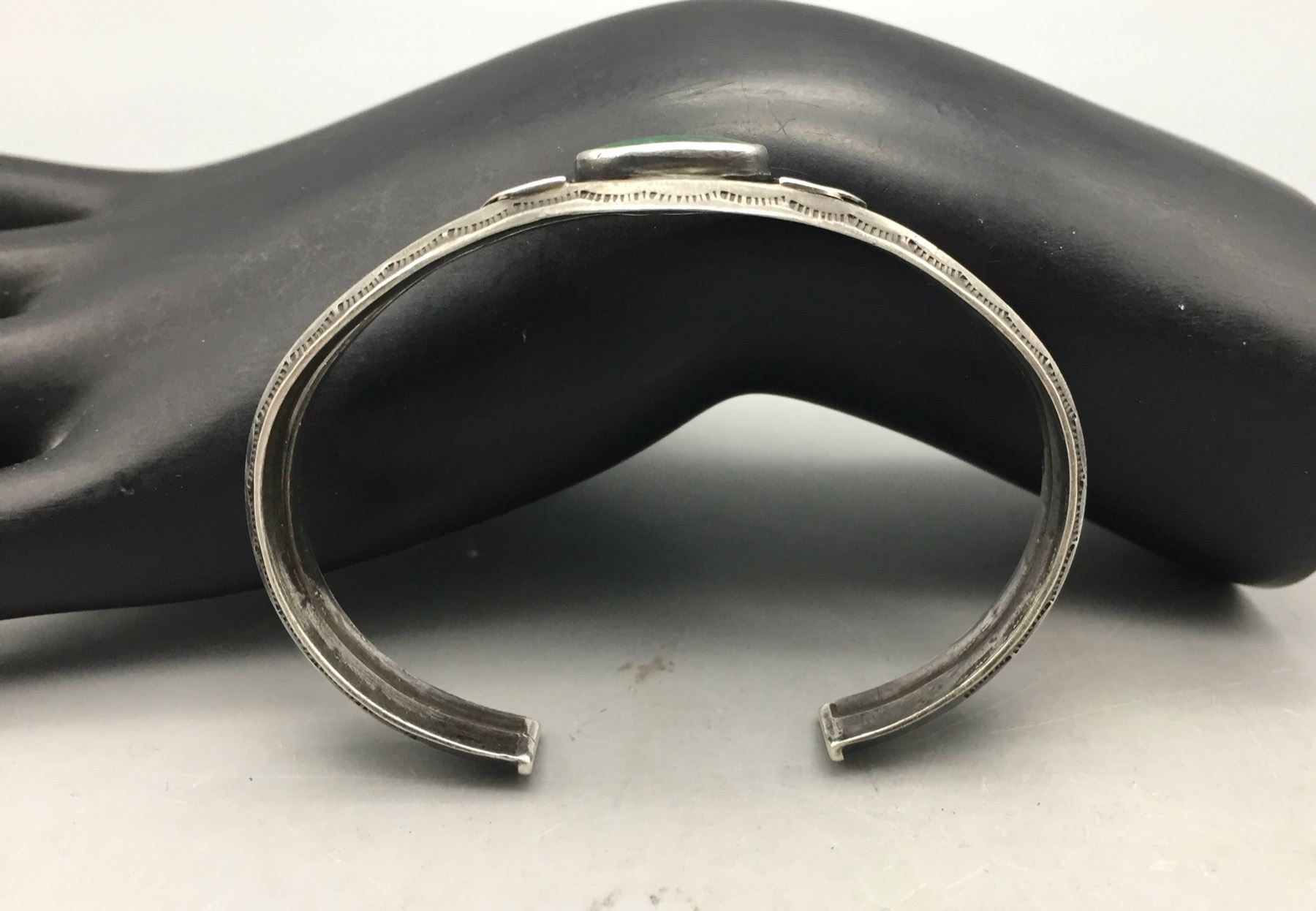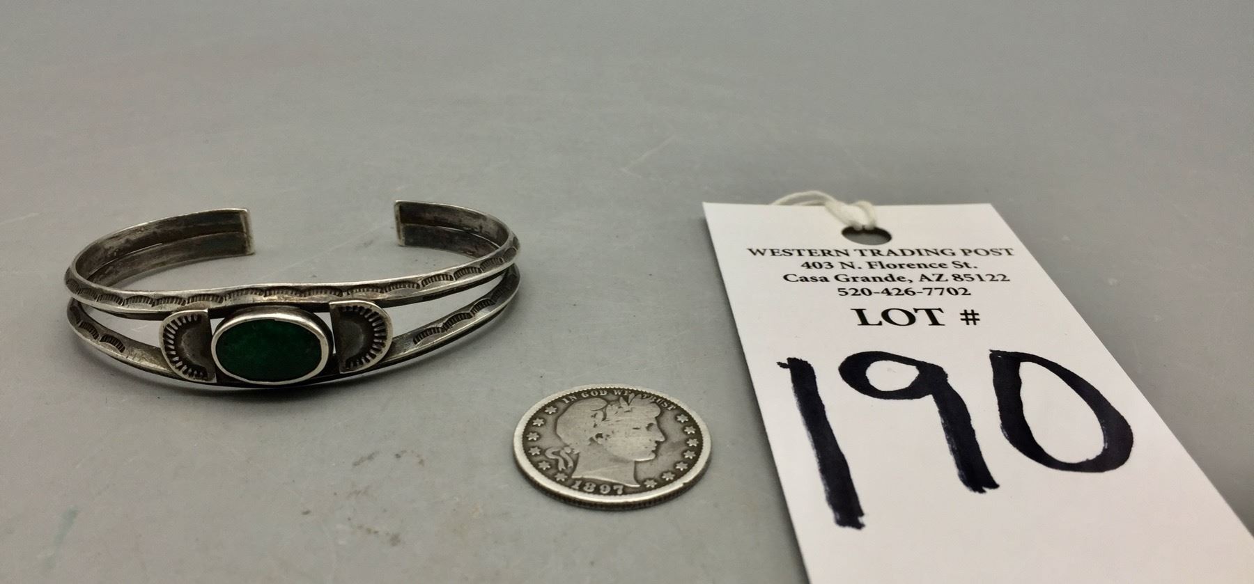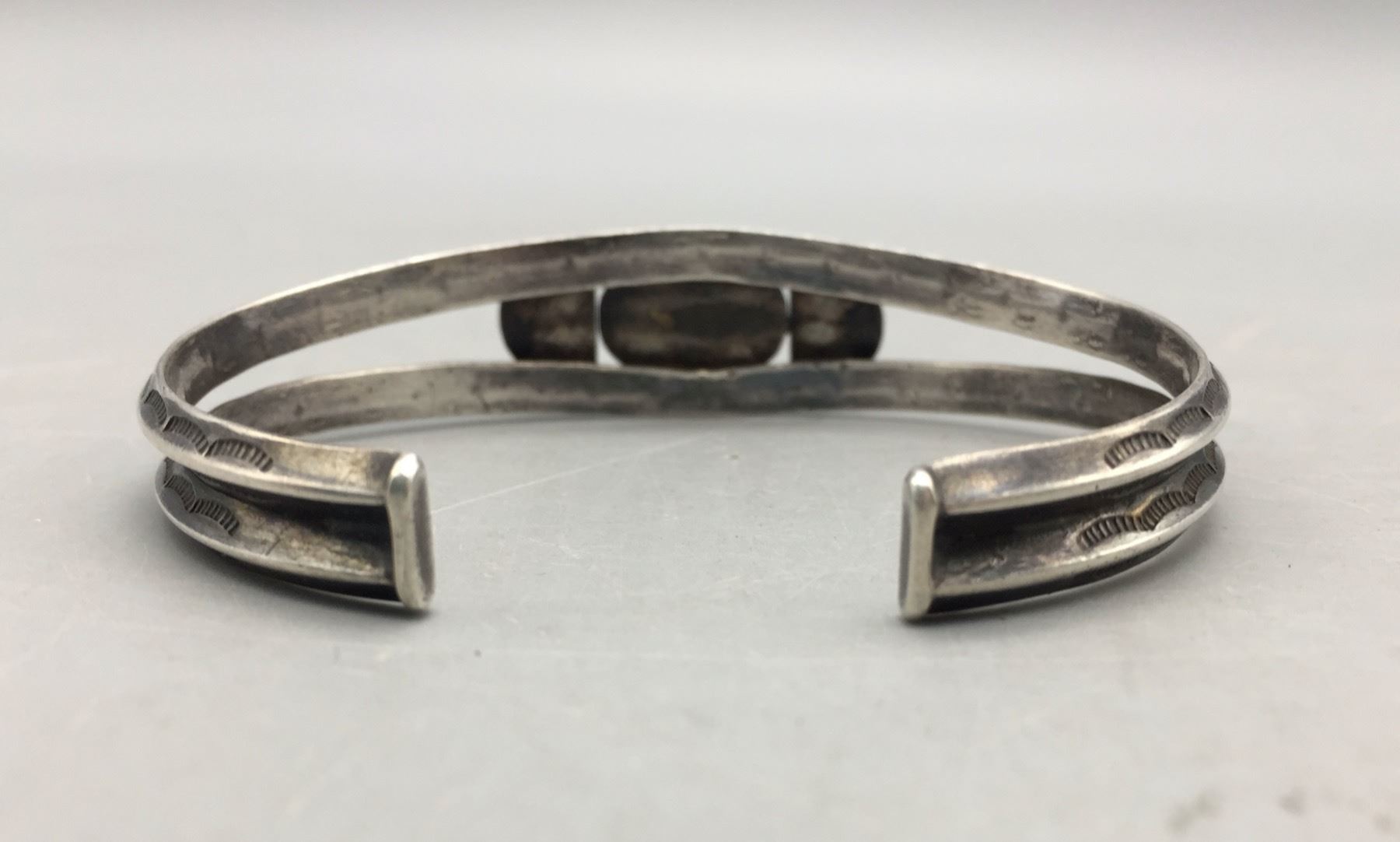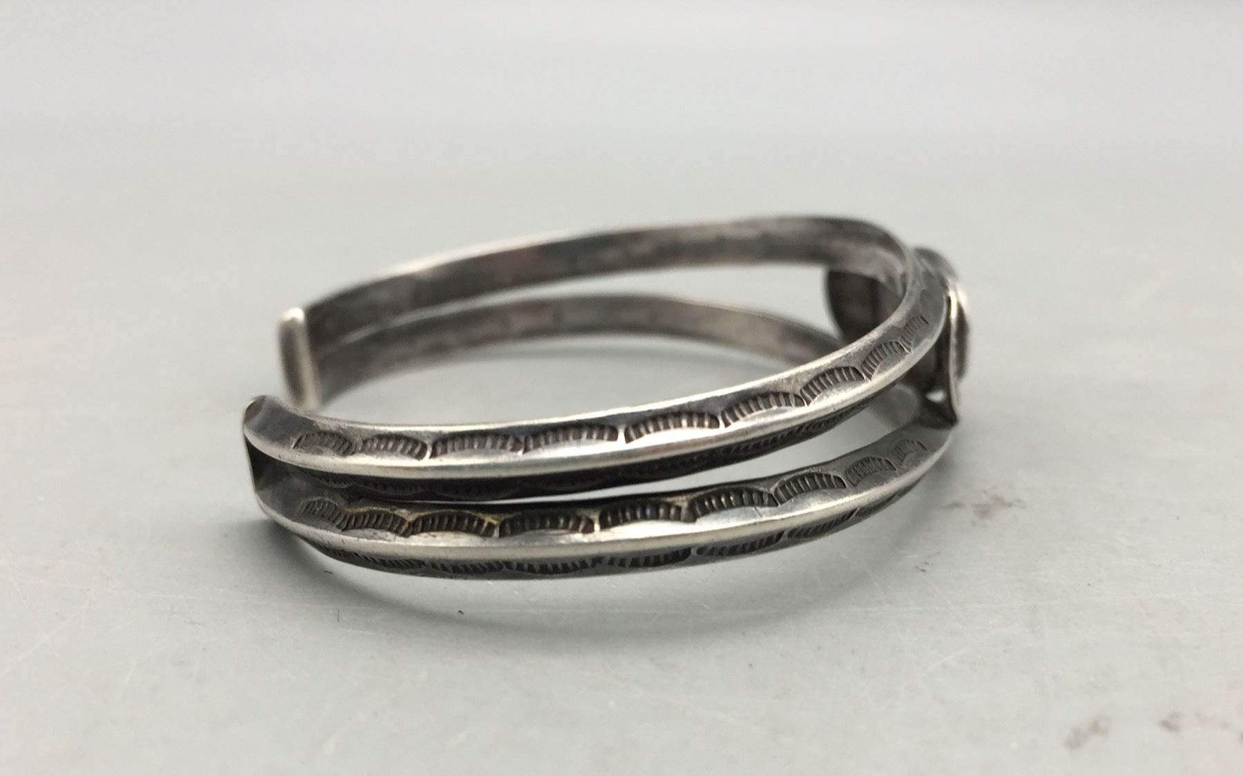 Description: Presented for sale in this lot is a nice, older turquoise and sterling silver bracelet. It has simple stamp work with a dark green turquoise stone set in sterling silver. Maker: Unknown. Approx. Age: Vintage. Size: Inside circumference measures 5-1/2â€. Opening is an additional 7/8â€, fitting a 6-3/8†wrist. Width is 5/8â€. Weighs 17.8 grams. Condition: Good for its age, normal wear expected. Please look closely at the pictures - they are an important part of our description. Shipping: There will be a $5 handling / packaging fee for shipping this lot. The actual cost of postage will be added on top of that.