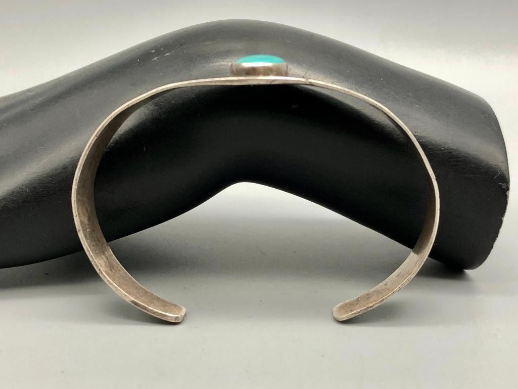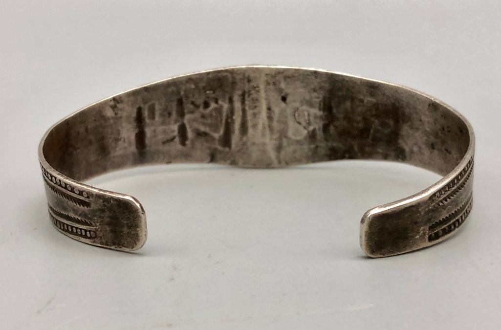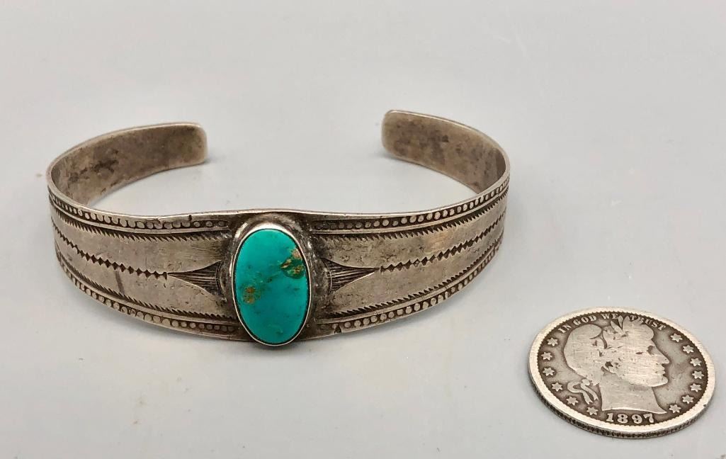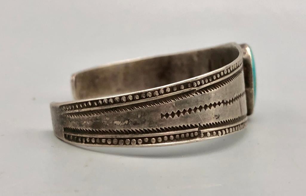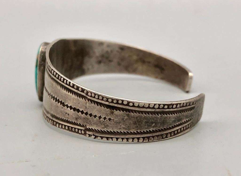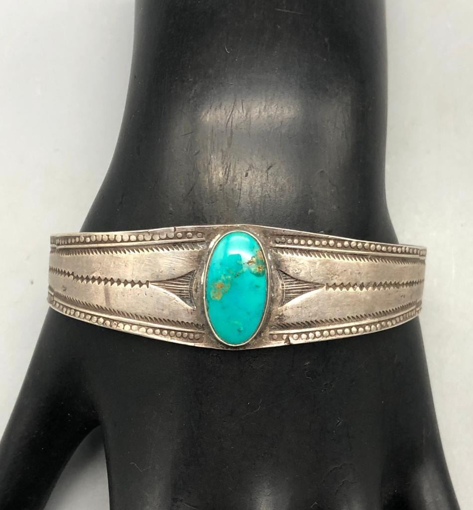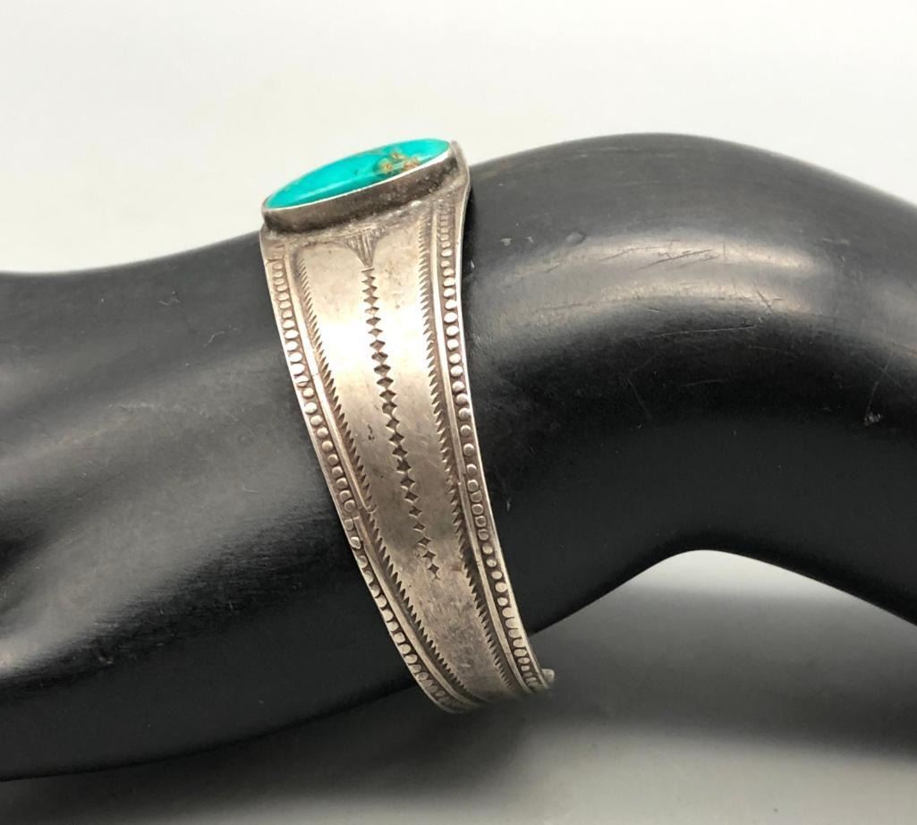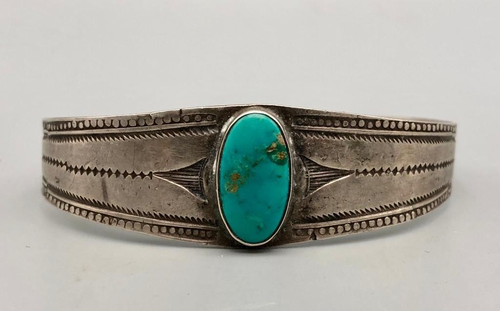 Up for consideration is an older turquoise and sterling silver bracelet. This is a beautiful bracelet set with a lovely turquoise cabochon. The cuff is a solid silver band with hand stamped designs. It is sterling silver and is perfect alone or stacked with others. MAKER: Unmarked. APPROX AGE: Circa 1940s-1950s. SIZE: Inside circumference measures 5-5/8 inches long. Opening is an additional 1-1/8 inches, fitting a 6-3/4 inch wrist. Width is 7/8 inches. Weighs 20.8 grams. CONDITION: Good for its age, normal wear expected. Please look closely at the pictures as they are an important part of our description and are hereby incorporated into the description, specifically with regards to condition. SHIPPING: There will be a $5 handling / packaging fee for shipping this lot. The actual cost of postage will be added on top of that. BUY IT NOW: If you would like to buy this item now, without waiting for the auction day to bid on it, we do offer this option (which is available up to 48 hours before the actual auction starts). The “Buy it Now†price is the high estimate of this lot (plus applicable fees and the Buyer's premium is discounted to 10% when using the Buy it Now option). If you would like to exercise this option, you must contact us by email (or phone as long as you talk to someone live). Reference this lot number and your intention to "Buy it Now."