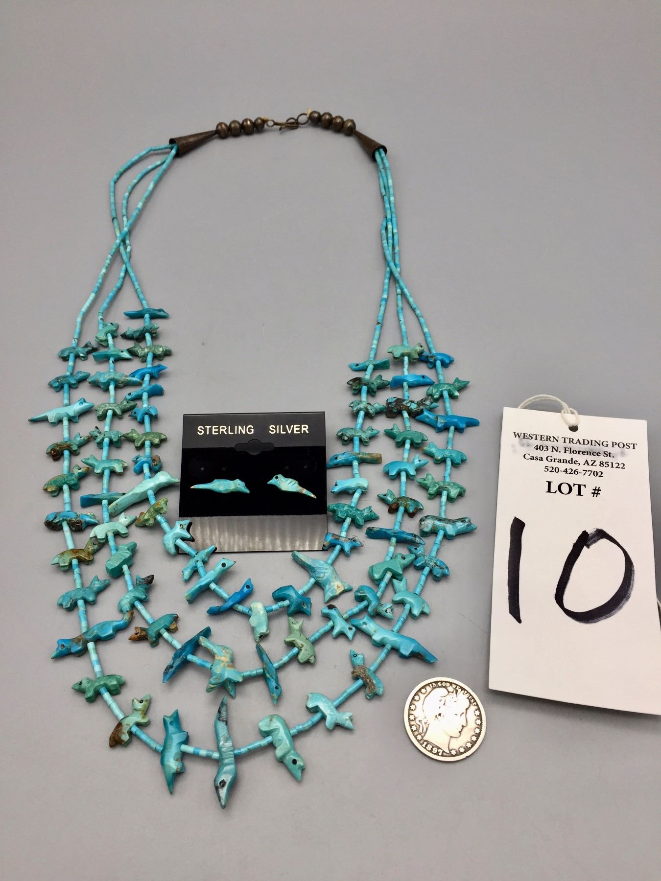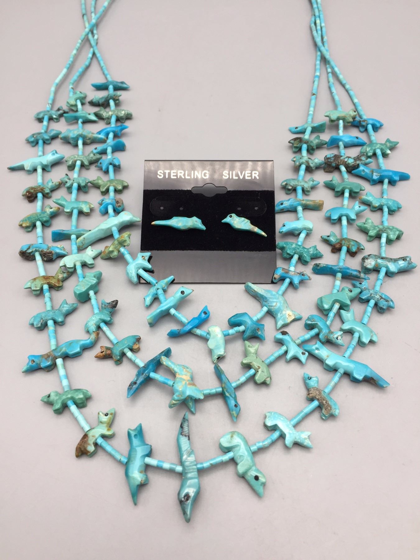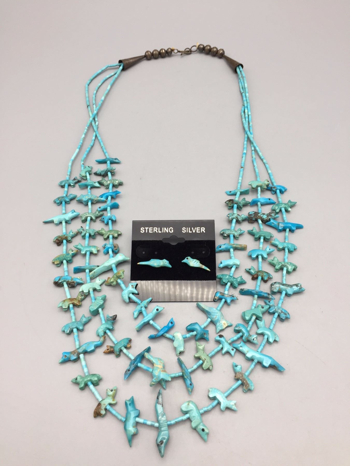 Description: Three strand Zuni fetish necklace with matching earrings. Maker: The Zuni artisan known only as, Old Man Acque. Approx. Age: Circa 1970. Size: Necklace is 29” around the neck and earrings are 3/4” w. Combined weight of 53.9 g. Condition: Good for their age, normal wear expected. Please look closely at the pictures - they are an important part of our description. Shipping: There will be a $5 handling / packaging fee for shipping this lot. The actual cost of postage will be added on top of that.