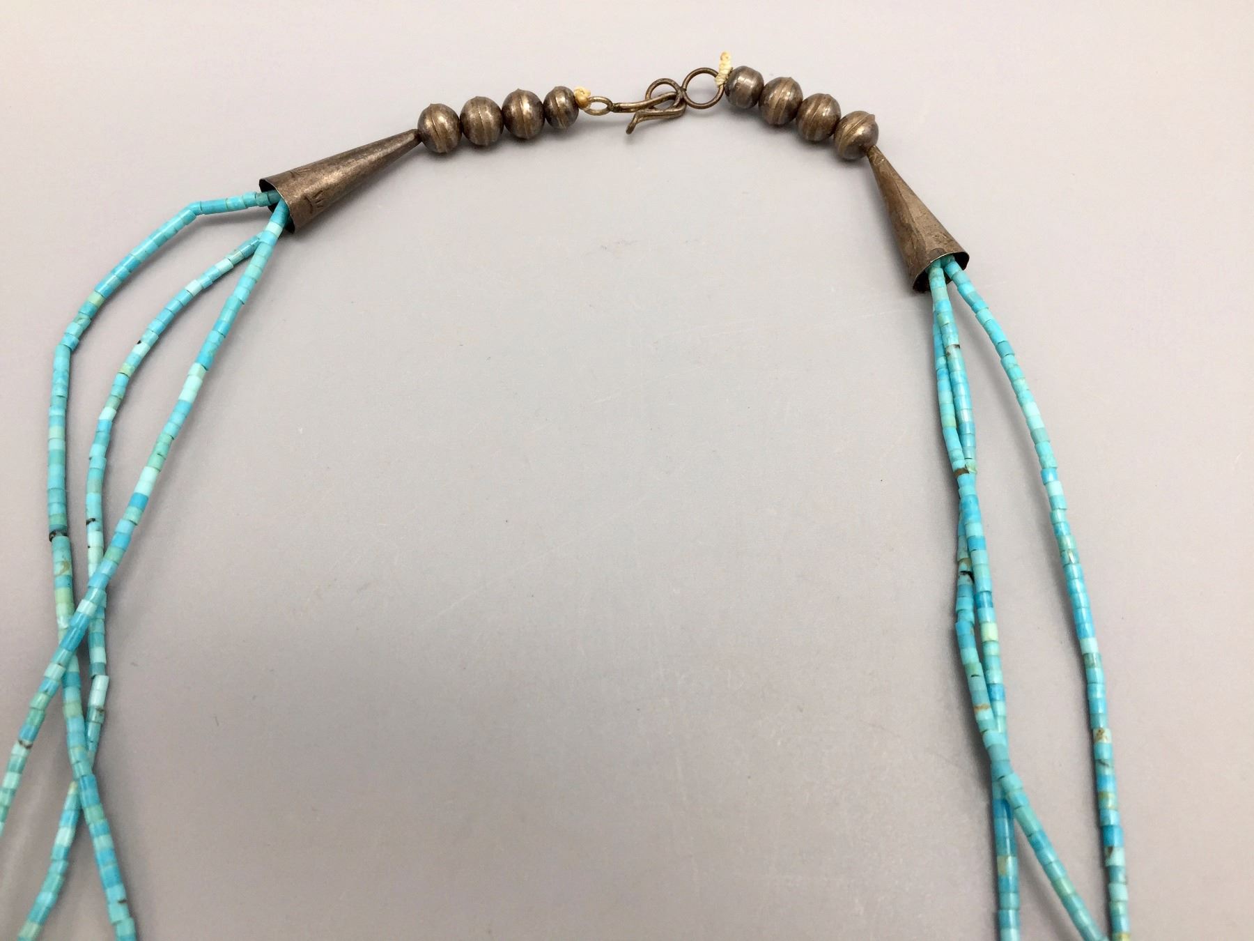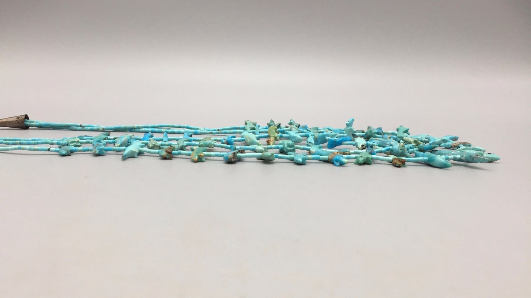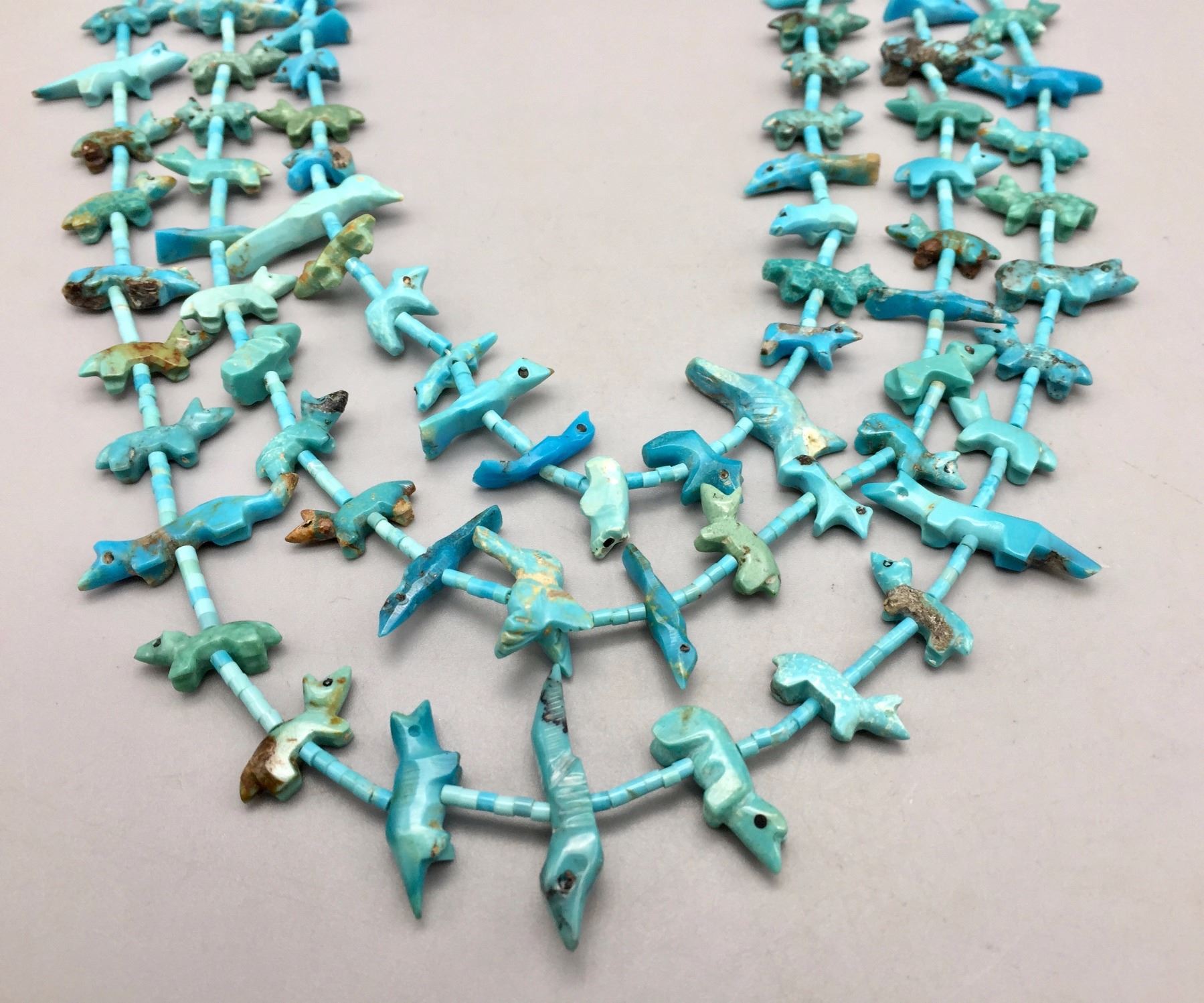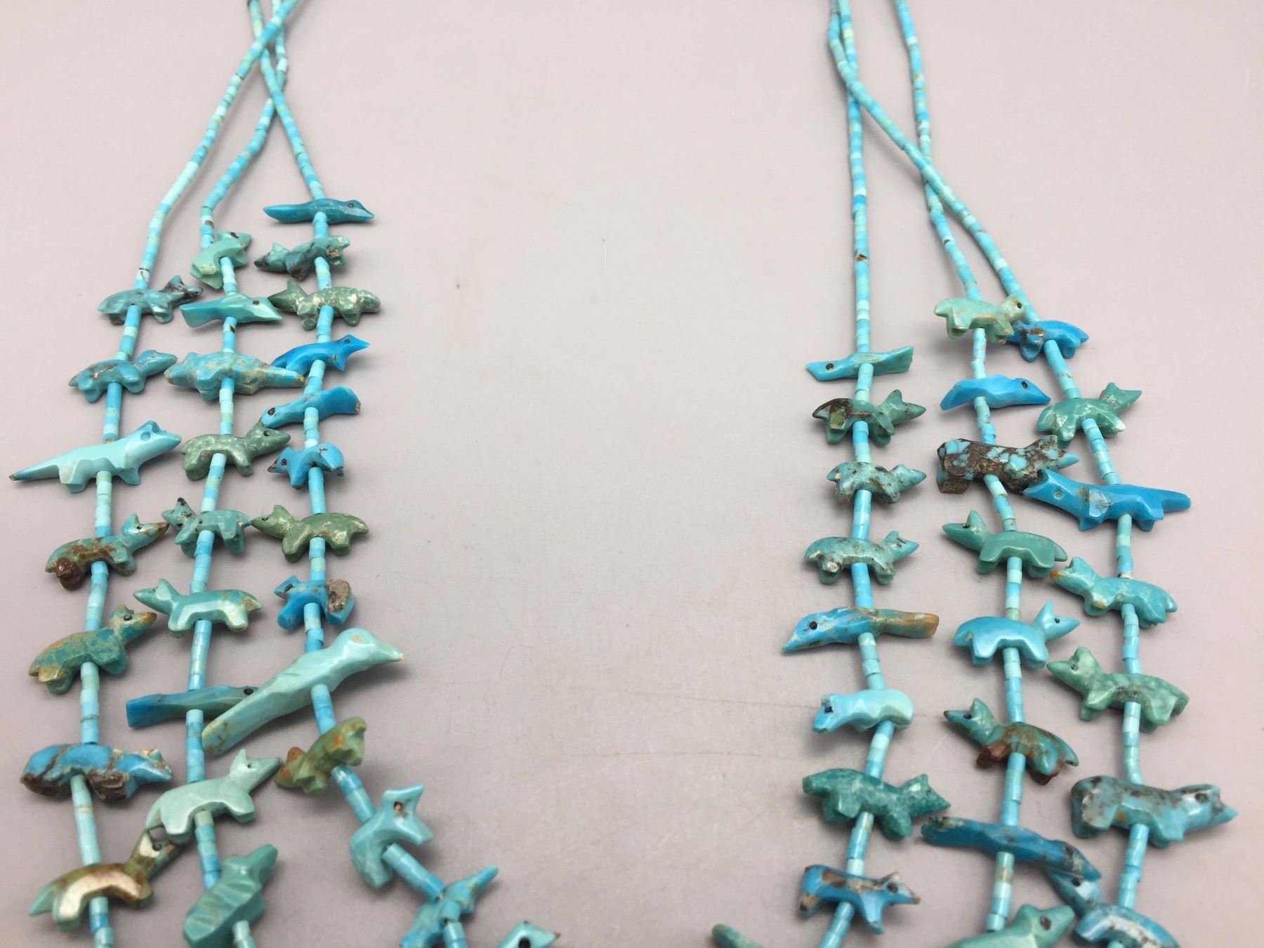 Description: Three strand Zuni fetish necklace with matching earrings. Maker: The Zuni artisan known only as, Old Man Acque. Approx. Age: Circa 1970. Size: Necklace is 29” around the neck and earrings are 3/4” w. Combined weight of 53.9 g. Condition: Good for their age, normal wear expected. Please look closely at the pictures - they are an important part of our description. Shipping: There will be a $5 handling / packaging fee for shipping this lot. The actual cost of postage will be added on top of that.