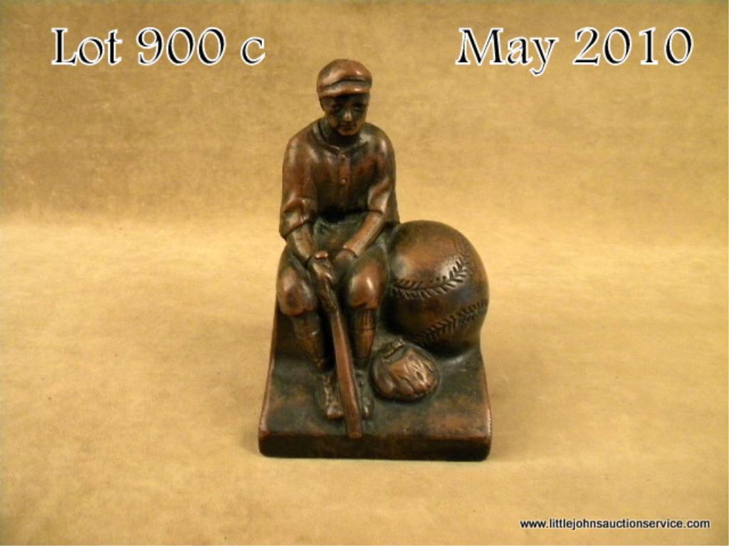 Older bronze type statue of baseball legend Honus Wagner, approx. 7” high by approx. 4” square with a lovely dark patina showing Wagner seated with a bat in his hands, glove at his feet and large baseball at his side. Est.: $100-$200.