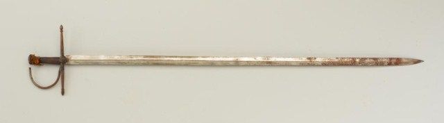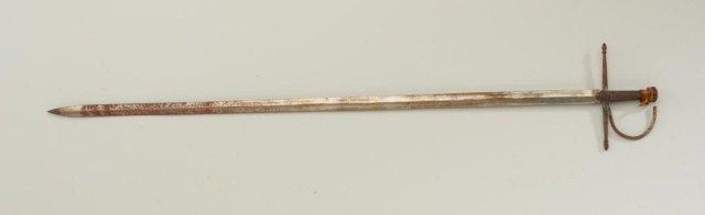 Older bull fighter’s sword with nickel blade marked “Toledo”, approx. 36-1/2” overall with simple cross guard and grip showing remnants of wrap; overall fair uncleaned condition. Est.: $100-$200.