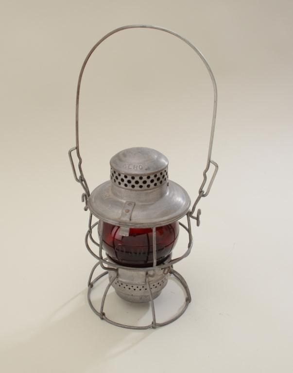 Older metal and red glass lens railroad lantern by Adlake in very good condition with long metal handle; body marked “D&RG WRR”. Est.: $100-$200.