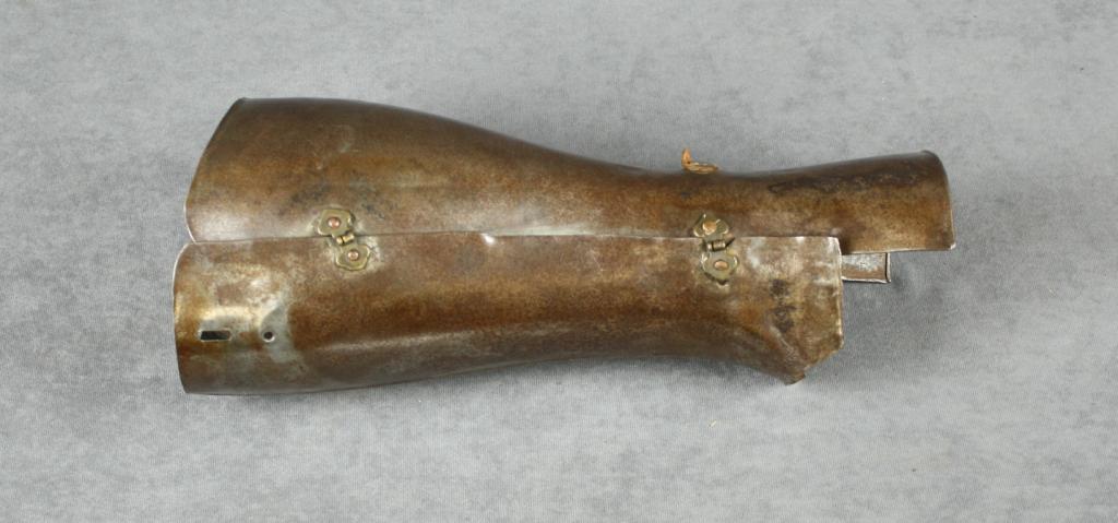 Older piece of hinged armor, likely a fencing arm guard, with dark patina and overall good. Est.: $150-$300.
