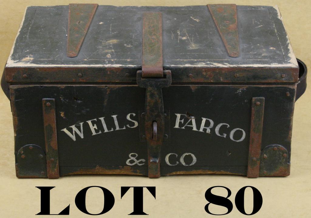 Older quality reproduction of a Wells Fargo & Co. wooden strongbox approx. 9” x 18” X 10” with iron straps and heavy iron hasp. This piece is in overall good condition showing aged and worn surfaces of wood that has beenpainted green with white lettering “WELLS FARGO & CO” on the front of the box; a great decorative item that would go great in an Old West theme den or collector’s office. Est.: $400-$800.