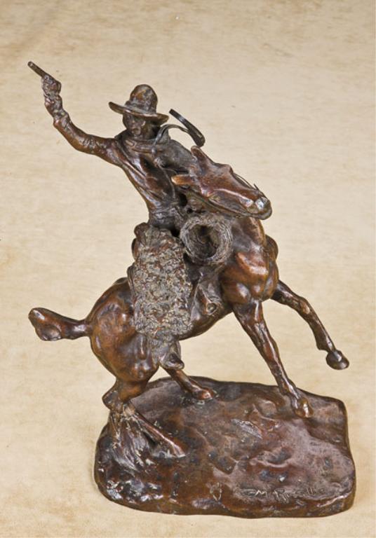 Older re-cast bronze of C.M. Russell’s “Smokin’ Up”, approx. 12” x 10” x 7” in overall very good condition with a pleasing deep patina and showing lots of action of a cowboy wearing wooly chap and raising his horse up on its back legs while he’s shooting his Colt SAA into the air. Est.: $500-$1,000.