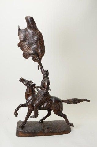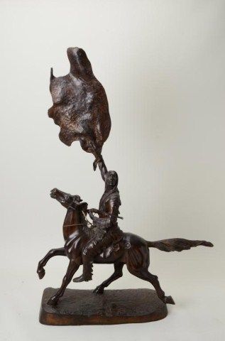 Older restrike of Frederic Remington’s bronze showing Indian signaling with hide. The bronze measures approx. 54-1/2” in ht. and is very good quality. Acquired by Robert Petersen thirty years ago or more. From theRobert Petersen Estate. Est.; $900-1,800