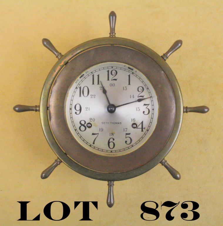 Older ship’s clock by Seth Thomas with brass body circled by a brass stern wheel in overall very good condition; unknown mechanical condition. Est.: $50-$100.