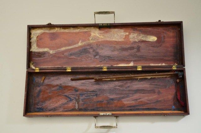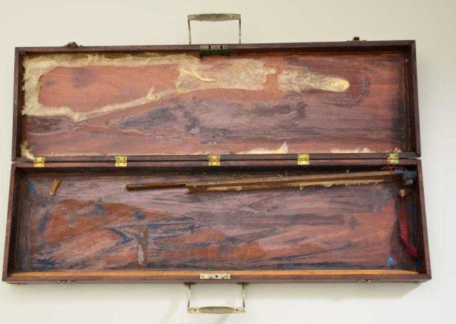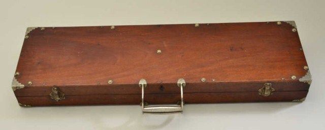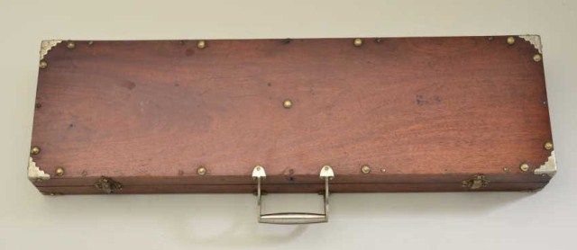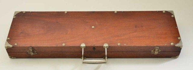 Older wooden carry case with metal corners, double front latches and two-piece metal handle, approx. 27-1/2” long by 8” wide and 3” deep in overall good condition; no interior and can be customized to hold asmall take down rifle or be set up to accommodate a pair of handguns with room for accessory compartments. Est.: $75-$150.