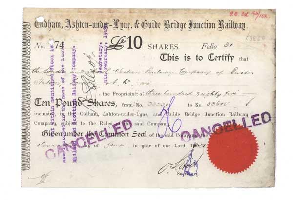 1901, Share certificate for 385 Ten Pound Shares. Black/White with Red Seal.