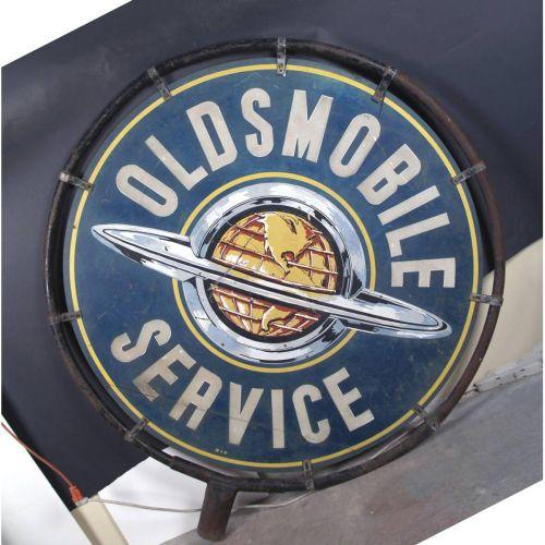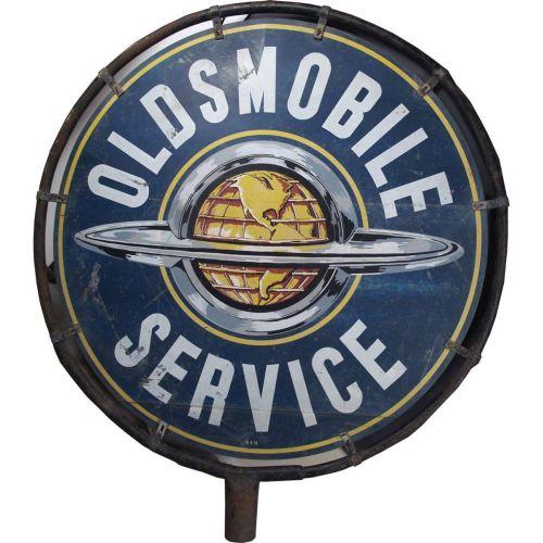 Oldsmobile Dealership Sign Dated 1953 in Original Pipe Frame Made of Sheet Metal & Painted Unique 2 piece sides as sheet metal only was available in 4 ft widths Sign itself 54" diameter Frame is a 5' pipe frame All original and in very good condition
