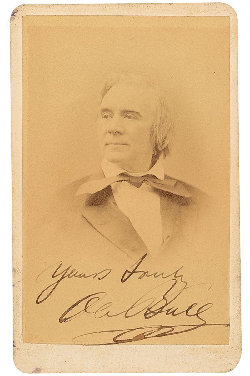 Norwegian violinist (1810–1880), often called Norway’s first international star. Original 2.5 x 4 carte-de-visite photo by Eduard, signed below the image in black ink, “Yours truly, Ole Bull.” In fine condition, with mounting remnants to reverse.