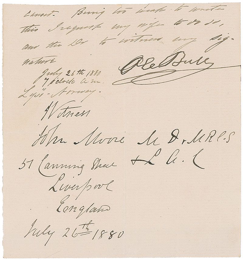 Norwegian violinist (1810–1880) often called Norway’s first international star. Partial LS, one page, 5.5 x 6, July 26, 1880. Clipped conclusion of a letter stating that he is too weak to write. In fine condition, with central vertical and horizontal folds.