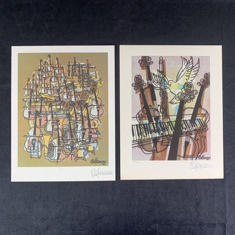 A pair of Ole Hamann limited edition prints, titled "Sextet with Dove, Trade and Development" 934/1000, and "1982 Definitives" 951/1000. Both included with certificates of authenticity from the World Federation of United Nations Associations. Both are in excellent condition.