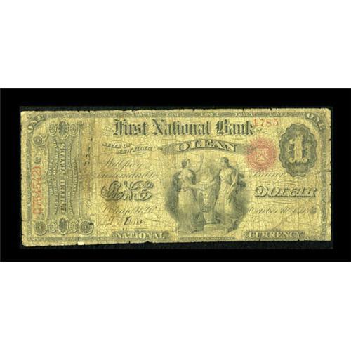 <B>Olean, NY</B></I> - $1 Original Fr. 382 <B>The First NB</B></I> Ch. # 1887<BR> This is just the first or second known ace on this bank depending upon the accuracy of the data in the census. This note has serial number 1785-C and the census has a 17851-D recorded that is in the same grade as this note. However, this bank only issued 1800 sheets of Original Series aces and deuces. These facts leads one to believe that this is the only documented ace on this bank. <B>Good-Very Good.</B></I><BR><BR><b>Shipping:</b> Coins & Currency (<a target="_blank" href="http://www.heritageauctions.com/common/shipping.php">view shipping information</a>)