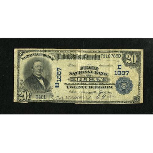 <B>Olean, NY</B></I> - $20 1902 Plain Back Fr. 654 <B>The First NB</B></I> Ch. # (E)1887<BR> The signatures remain on this Cattaraugus County issue. <B>Very Good.</B></I><BR><BR><b>Shipping:</b> Coins & Currency (<a target="_blank" href="http://www.heritageauctions.com/common/shipping.php">view shipping information</a>)