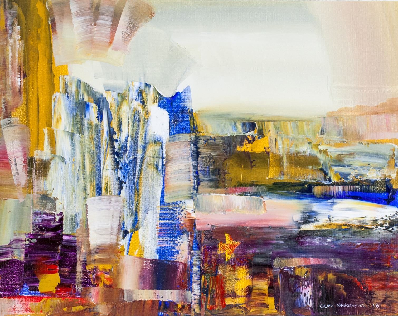 Oil on stretched canvas. Featuring abstract composition. Signed by the artist Oleg Nedoshytko on the lower right corner and dated 2018. 40 x 50 cm (16 x 20 inches). Oleg Nedoshytko b.1950, 950 Canadian Ukrainian. At twenty one, he was listed in reserve after serving his mandatory military term as a nurse, and his choice of a career seemed predetermined: with his experience, the doors of a highly prestigious Medical School were open for him. In the meantime, he looked for a summer job in his native city of Odessa, a large port city on the Black Sea in southern Ukraine. He found it in a commercial advertising studio. That day changed his life. Working with paint opened a new world for him. From that point on, his suddenly discovered passion for art took care of his future.