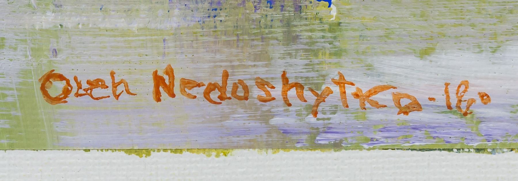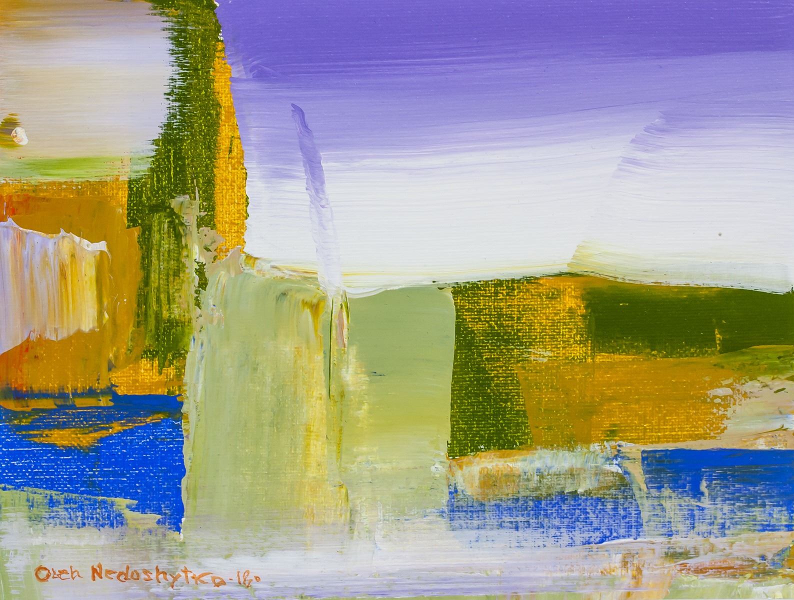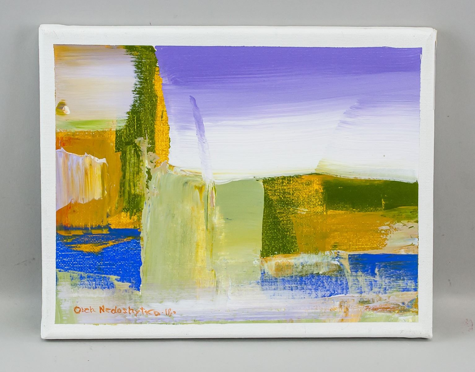 Oil on stretched canvas. Featuring abstract composition. Signed by the artist Oleg Nedoshytko on the lower left corner. Signed Oleg Nedoshytko and dated 2018 on verso. 20 x 25.5 cm (7.8 x 10 inches). Oleg Nedoshytko b.1950, Canadian Ukrainian. At twenty one, he was listed in reserve after serving his mandatory military term as a nurse, and his choice of a career seemed predetermined: with his experience, the doors of a highly prestigious Medical School were open for him. In the meantime, he looked for a summer job in his native city of Odessa, a large port city on the Black Sea in southern Ukraine. He found it in a commercial advertising studio. That day changed his life. Working with paint opened a new world for him. From that point on, his suddenly discovered passion for art took care of his future.