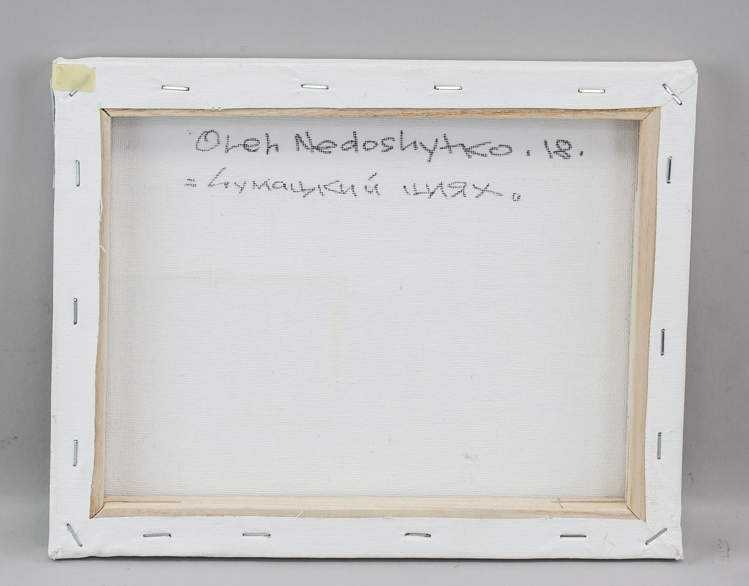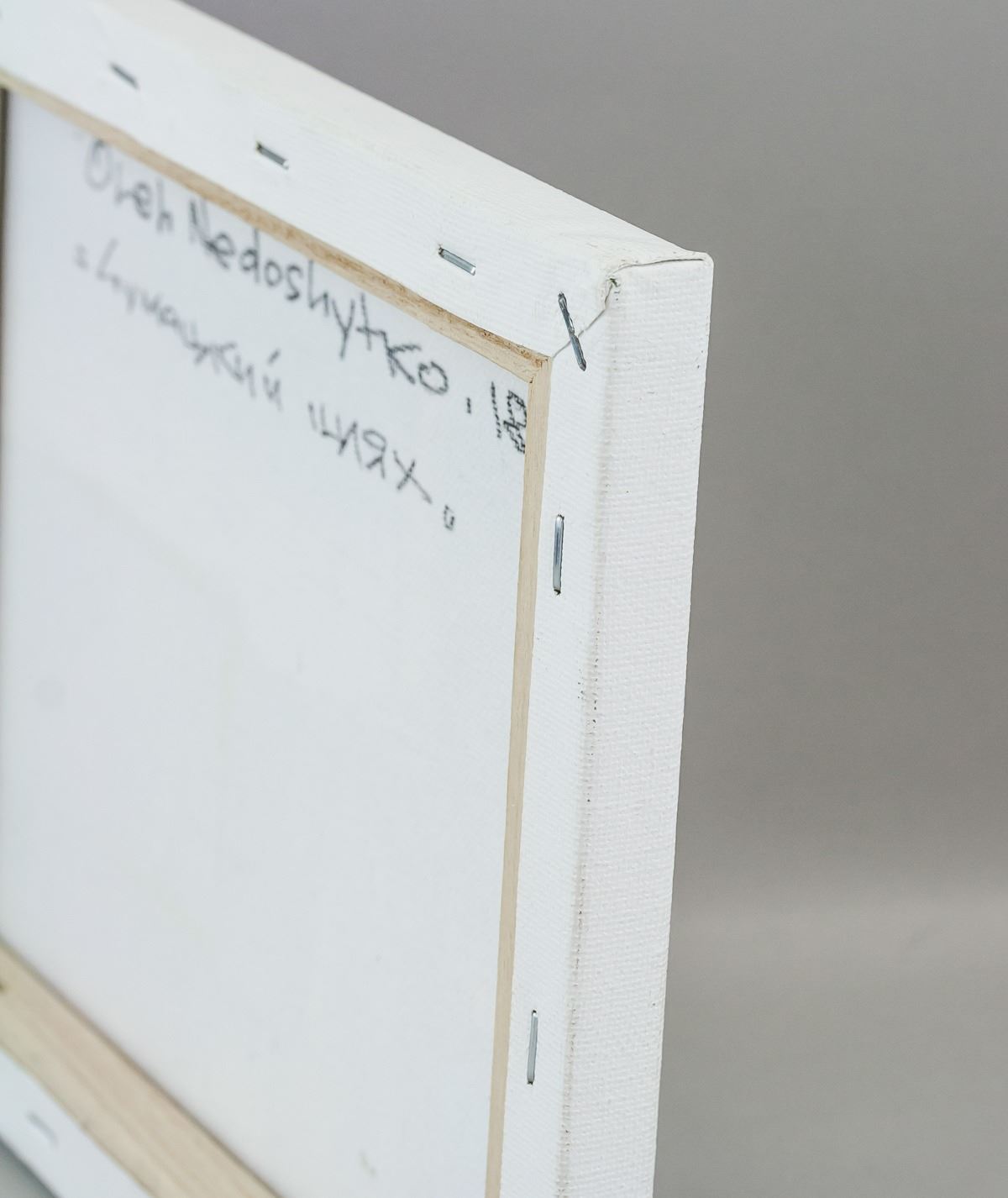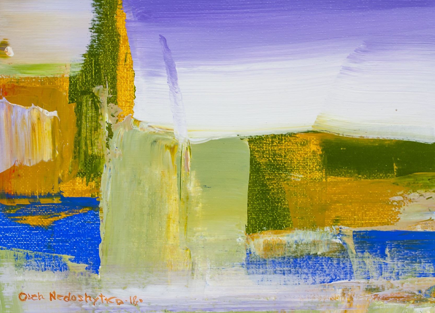Oil on stretched canvas. Featuring abstract composition. Signed by the artist Oleg Nedoshytko on the lower left corner. Signed Oleg Nedoshytko and dated 2018 on verso. 20 x 25.5 cm (7.8 x 10 inches). Oleg Nedoshytko b.1950, Canadian Ukrainian. At twenty one, he was listed in reserve after serving his mandatory military term as a nurse, and his choice of a career seemed predetermined: with his experience, the doors of a highly prestigious Medical School were open for him. In the meantime, he looked for a summer job in his native city of Odessa, a large port city on the Black Sea in southern Ukraine. He found it in a commercial advertising studio. That day changed his life. Working with paint opened a new world for him. From that point on, his suddenly discovered passion for art took care of his future.