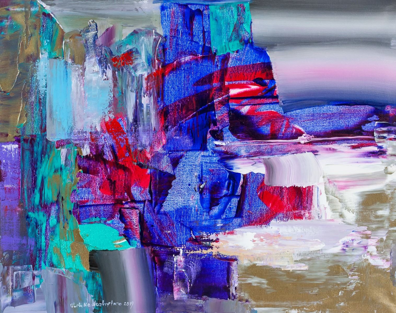 Oil on stretched canvas. Featuring abstract composition. Signed by the artist Oleg Nedoshytko on the lower left corner and dated 2019. 34 x 50 cm (13.4 x 19.7 inches). Oleg Nedoshytko b.1950, Canadian Ukrainian. At twenty one, he was listed in reserve after serving his mandatory military term as a nurse, and his choice of a career seemed predetermined: with his experience, the doors of a highly prestigious Medical School were open for him. In the meantime, he looked for a summer job in his native city of Odessa, a large port city on the Black Sea in southern Ukraine. He found it in a commercial advertising studio. That day changed his life. Working with paint opened a new world for him. From that point on, his suddenly discovered passion for art took care of his future.