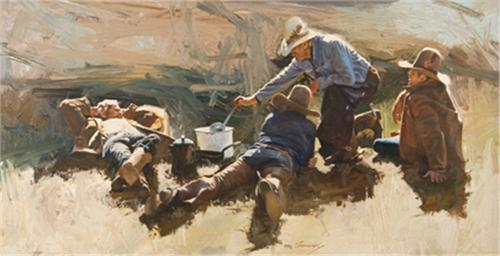 Oleg Stavrowsky (b. 1927). Texas Stew. 26" x 50" oil on canvas. Signed lower center. (est $15,000-18,000).Provenance: Coile Collection.