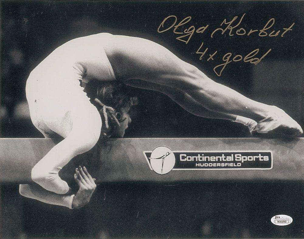 Satin-finish 14 x 11 photo of Korbut on the balance beam, signed in gold ink, “Olga Korbut, 4x gold.” In fine condition, with a JSA label affixed to the lower right corner. Accompanied by a certificate of authenticity from JSA.