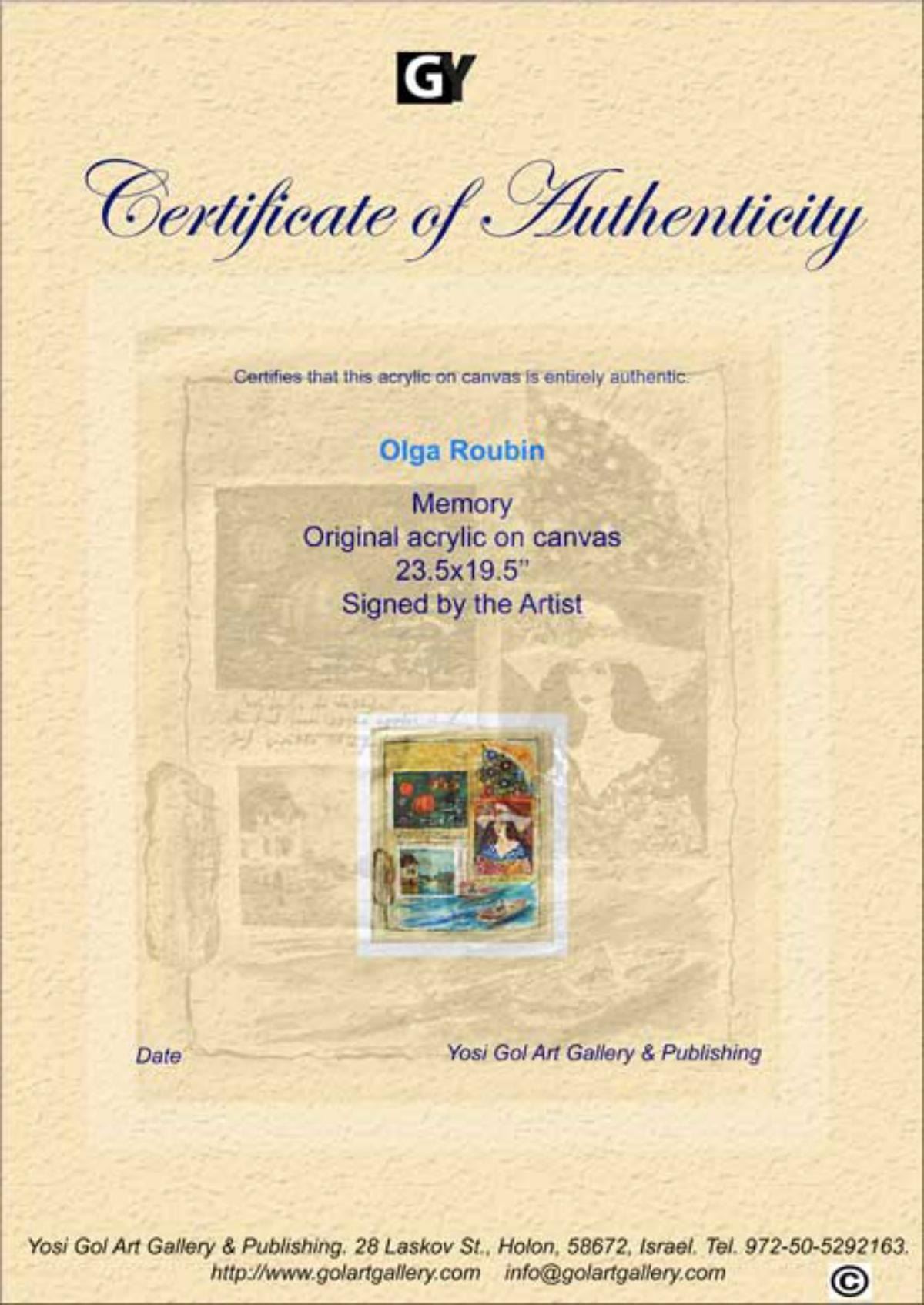Artist: Olga Roubin. Medium: Original Acrylic On Canvas. Title: Memory. Size (Unframed): 23.5" x 19.5". Certificate of Authenticity: From the publisher. Reference# 10257.