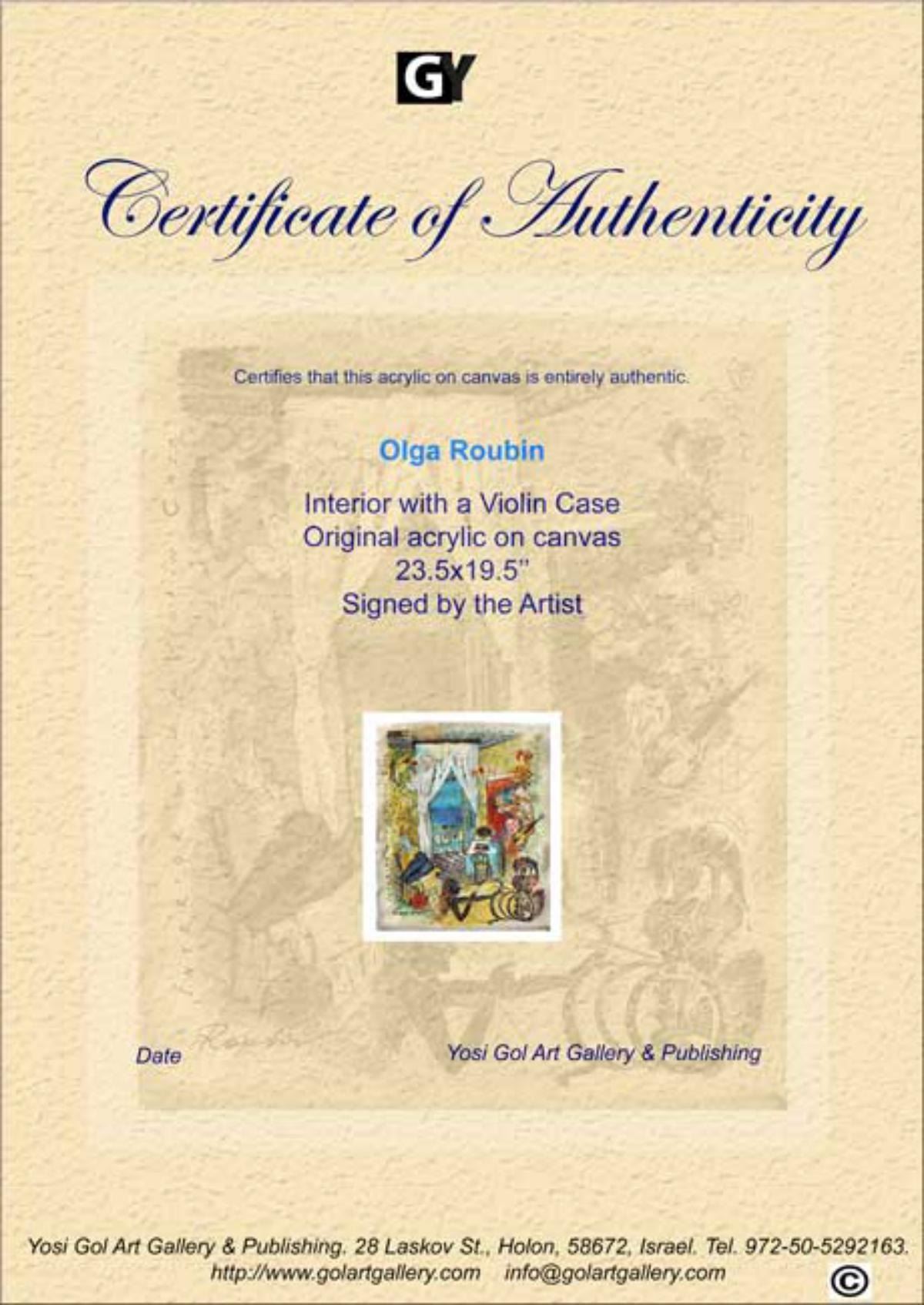 Artist: Olga Roubin. Medium: Original Acrylic On Canvas. Title: Violin Case. Size (Unframed): 23.5" x 19.5". Certificate of Authenticity: From the publisher. Reference# 10256.