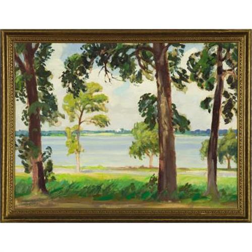 <B>OLIN TRAVIS (American, 1888-1975)</B></I><BR><I>White Rock Lake</B></I><BR>Oil on canvas board<BR>18 x 24 inches (45.7 x 61.0 cm)<BR>