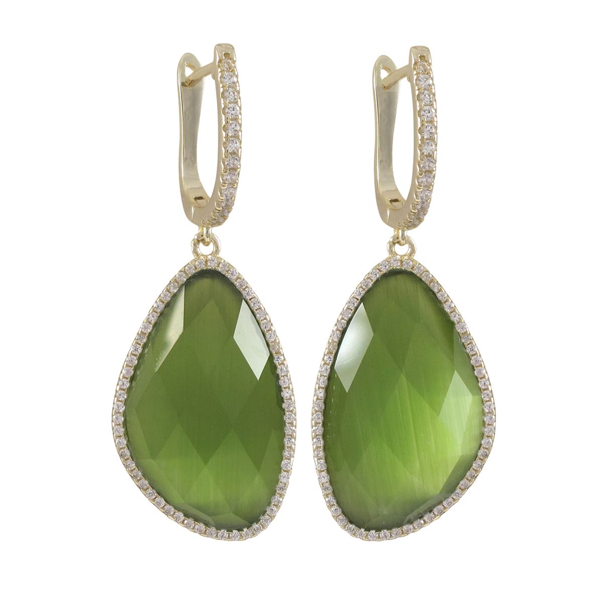 Olive Cat's Eye Semi Precious Faceted Stone, With CZ Border, On Gold Plated Sterling Silver Lever Back Earrings, 1.77&Quot;