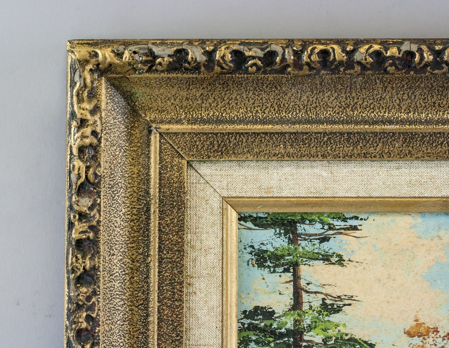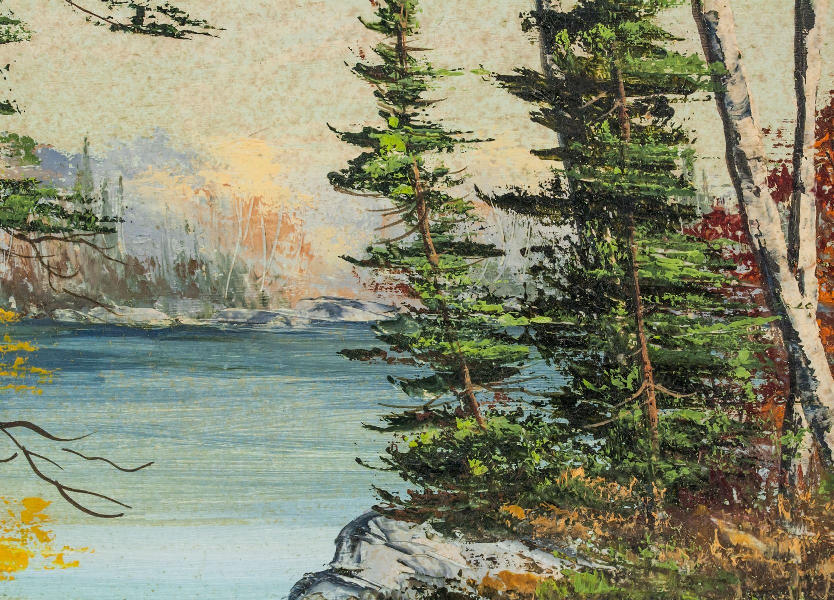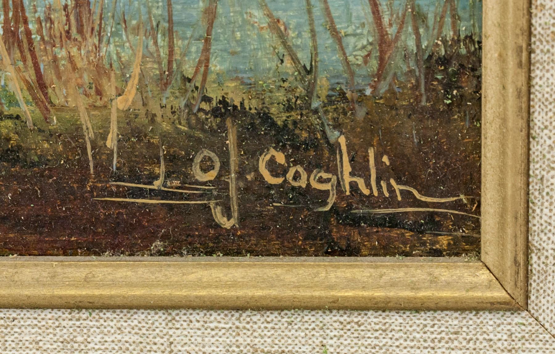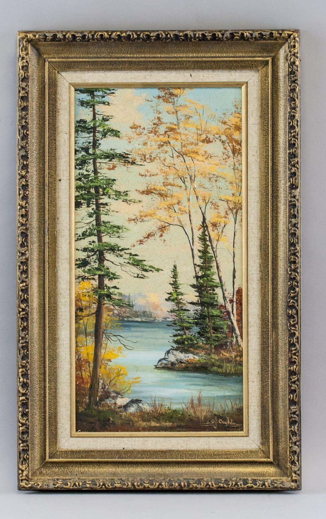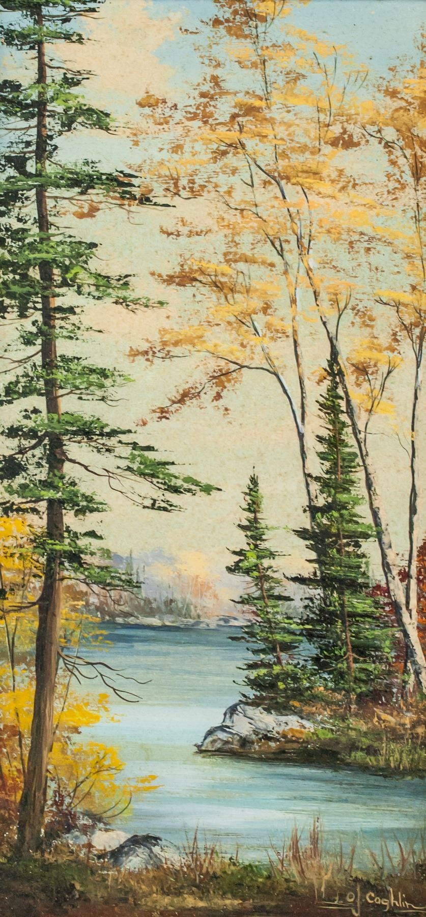 Oil on canvas, framed. Featuring landscape scene. Signed "OJ Coghlin". "Many Thanks Love Randy + Cindy" inscribed on verso. "Rushog Lake Near Minden". Attributed to Olive J. Coghlin (Canadian). 51 x 26 cm (20 x 10 in), Frame: 67 x 41 cm (26 x 16 in). Provenance: Ontario estate (Waterdown)