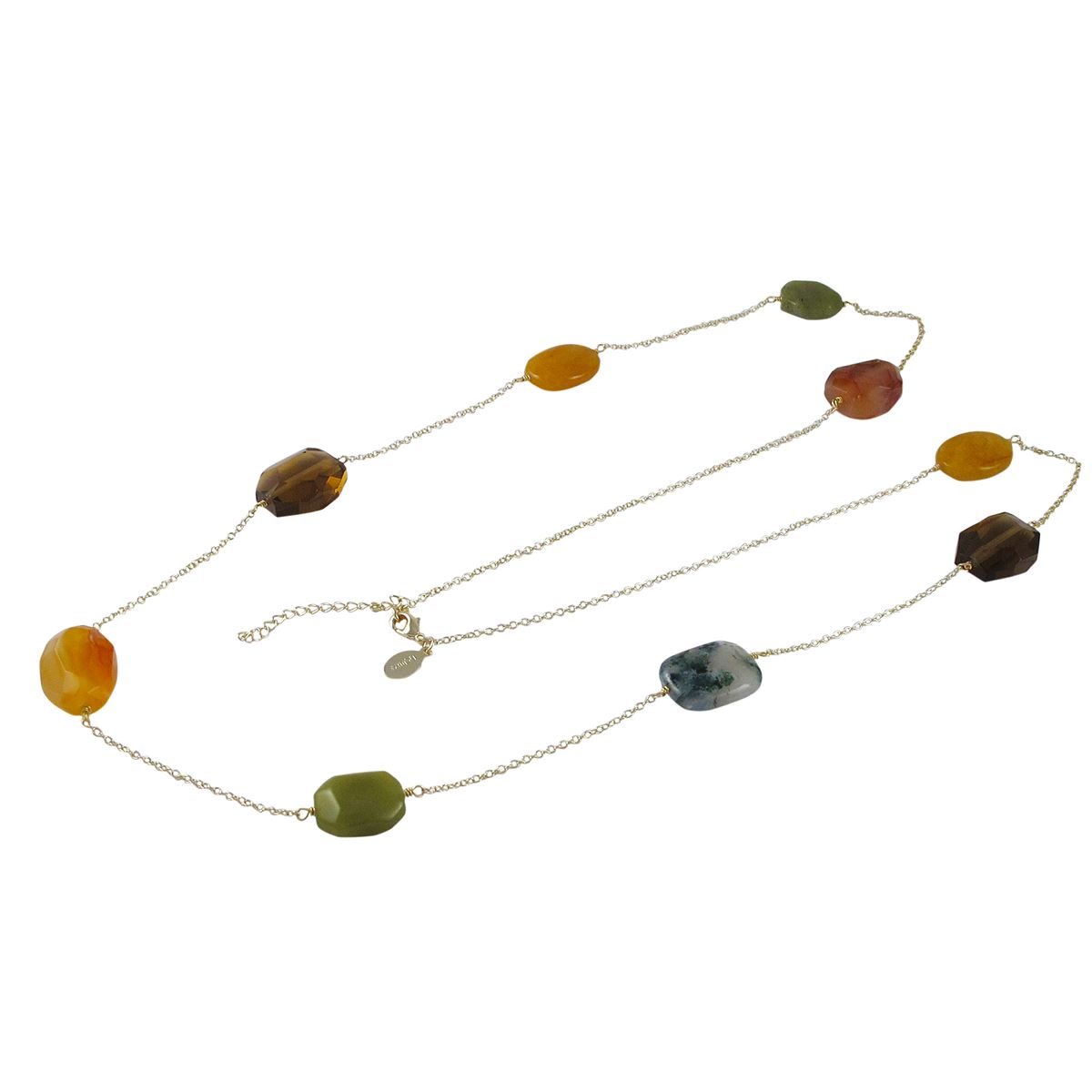 Olive Jade And Smokey Combination Semi Precious Faceted Stones On Gold Plated Sterling Silver Chain- 36"