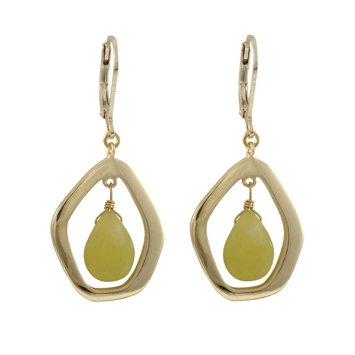 Olive Jade Semi Precious Teardrop Stone In Gold Plated Sterling Silver Open Pentagon Shape CZ Lever Back Earrings, 1.69"