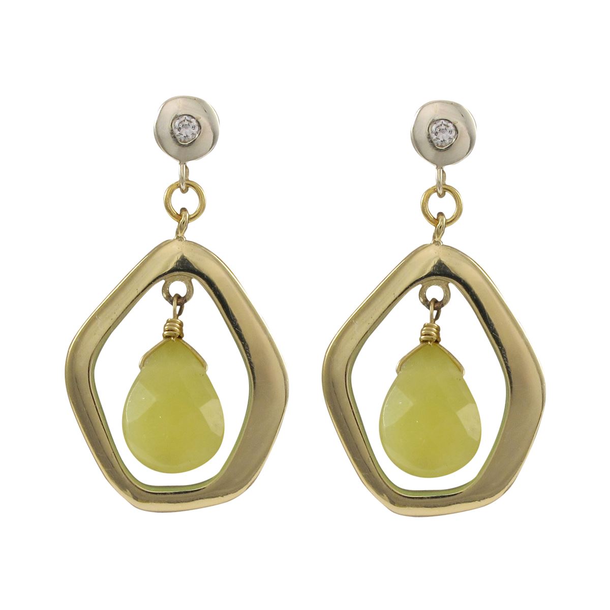 Olive Jade Semi Precious Teardrop Stone In Gold Plated Sterling Silver Open Pentagon Shape CZ Post Earrings, 1.38"
