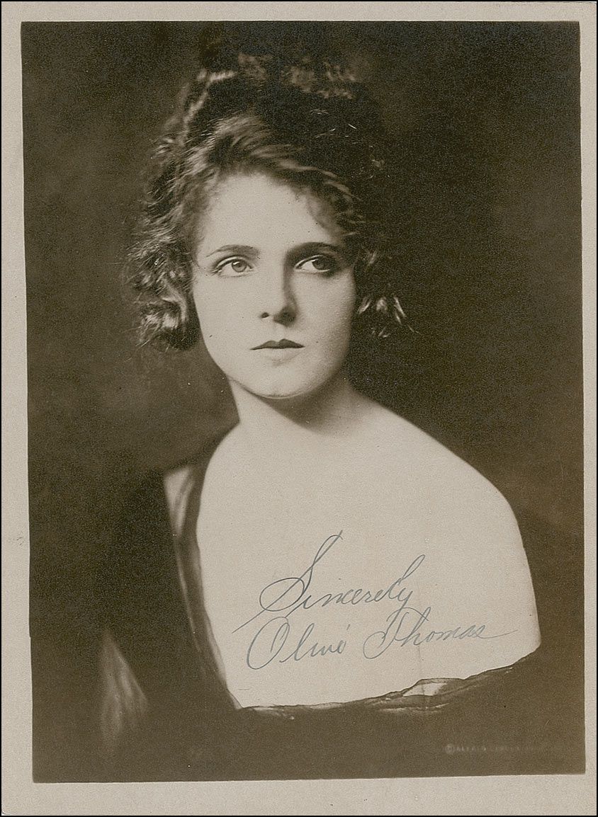 Actress, model, and dancer (1894–1920) widely admired as ‘the world’s most beautiful girl,’ she died under mysterious circumstances in 1920 at the height of her career. Vintage matte-finish 5 x 6.5 photo, signed in fountain pen, “Sincerely, Olive Thomas.” In fine condition, with a bit of scattered light silvering.